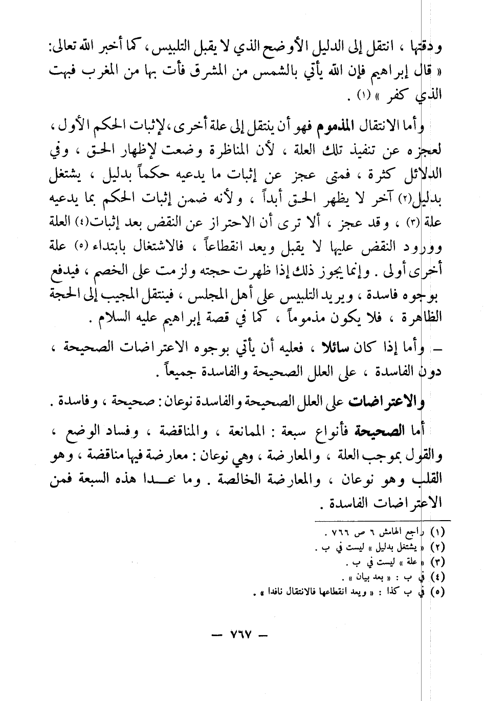 أما الانتقال المذموم فهو أن ينتقل إلى علة أخرى، لإثبات الحكم الأول، لعجزه عن تنفيذ تلك العلة، لأن الناظرة وضعت لإظهار الحق، وفي الدلائل كثرة، فمتى عجز عن إثبات ما يدعيه حكماً بدليل، يشتغل بدليل (¬2) آخر لا يظهر الحق أبداً، ولأنه ضمن إثبات الحكم بما يدعيه علة (¬3)، وقد عجز، ألا ترى أن الاحتراز عن النقض بعد إثبات (¬4) العلة وورود النقض عليها لا يقبل ويعد إنقطاعاً، فالاشتغال بابتداء (¬5) علة أخرى أولى. وإنما يجوز ذلك إذا ظهرت حجته ولزمت على الخصم، فيدفع بوجوه فاسدة، ويريد التلبيس على أهل المجلس، فينتقل المجيب إلى الحجة الظاهرة، فلا يكون مذموماً، كما في قصة إبراهيم عليه السلام.