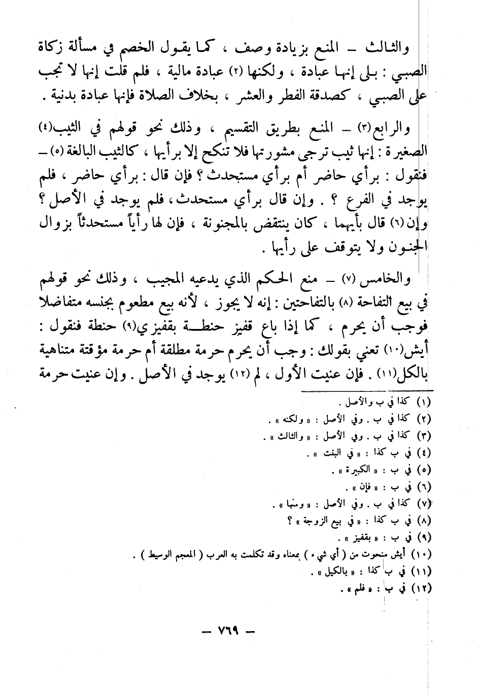 والخامس (¬7) - منع الحكم الذي يدعيه المجيب، وذلك نحو قولهم في بيع التفاحة (¬8) بالتفاحتين: إنه لا يجوز، لأنه بيع مطعوم بجنسه متفاضلا فوجب أن يحرم، كما إذا باع قفيز حنطة بقفيزي (¬9) حنطة فنقول: أيش (¬10) تعني بقولك: وجب أن يحرم حرمة مطلقة أم حرمة مؤقتة متناهية بالكل (¬11). فإن عنيت الأول، لم (¬12) يوجد في الأصل. وإن عنيت حرمة