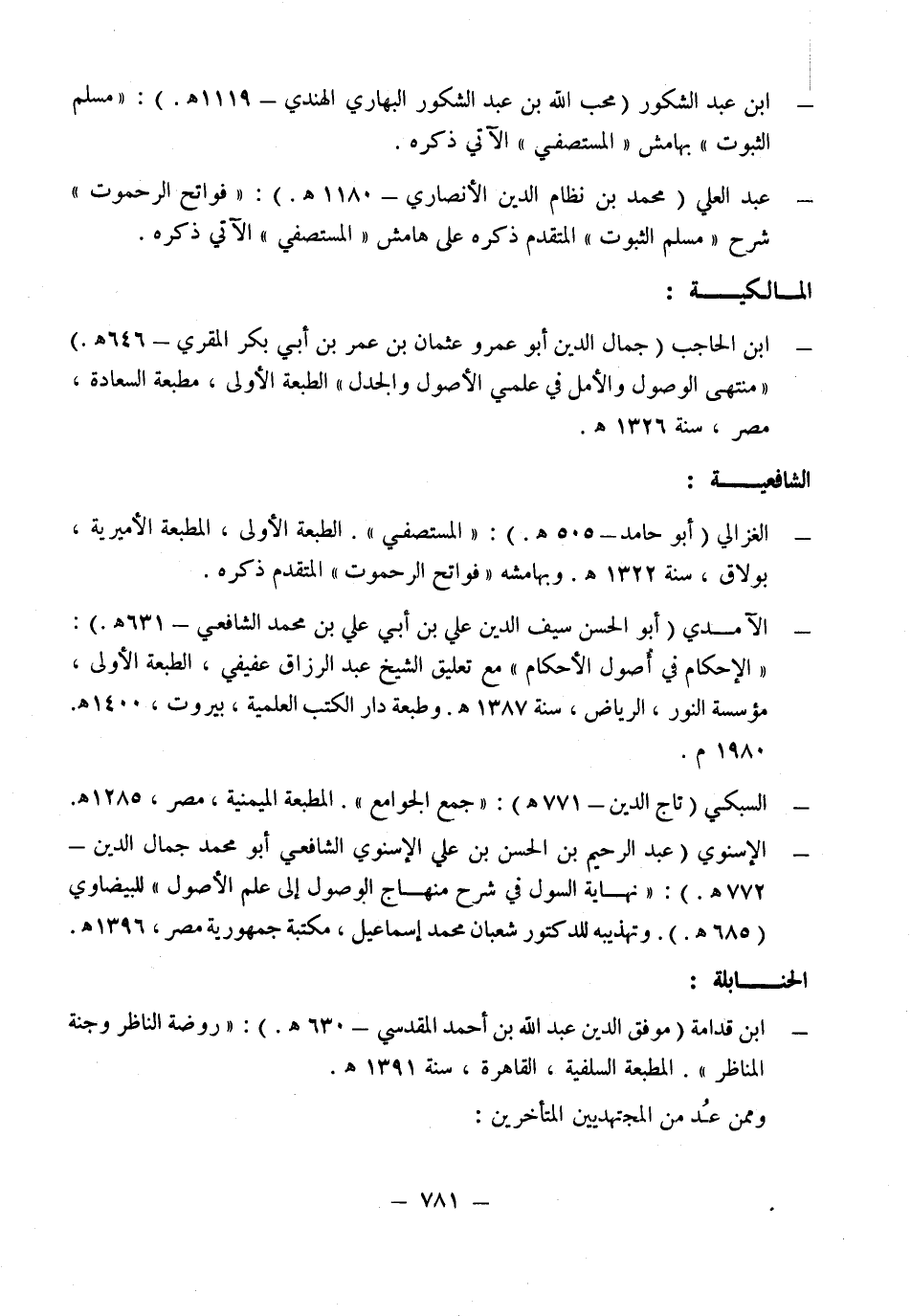 - ابن عبد الشكور (محب الله بن عبد الشكور البهاري الهندي - 1119 هـ.): "مسلم الثبوت" بهامش "المستصفي" الآتي ذكره.