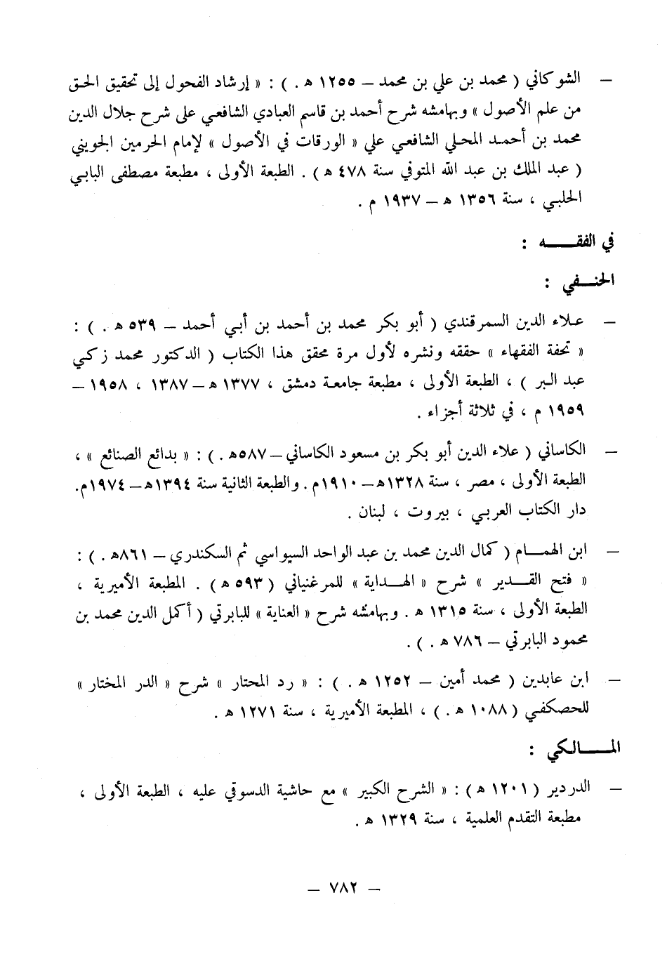 - ابن عابدين (محمد أمين - 1252 هـ.): "رد المحتار" شرح "الدر المختار" للحصكفي (1088 هـ.)، المطبعة الأميرية، سنة 1271 هـ.