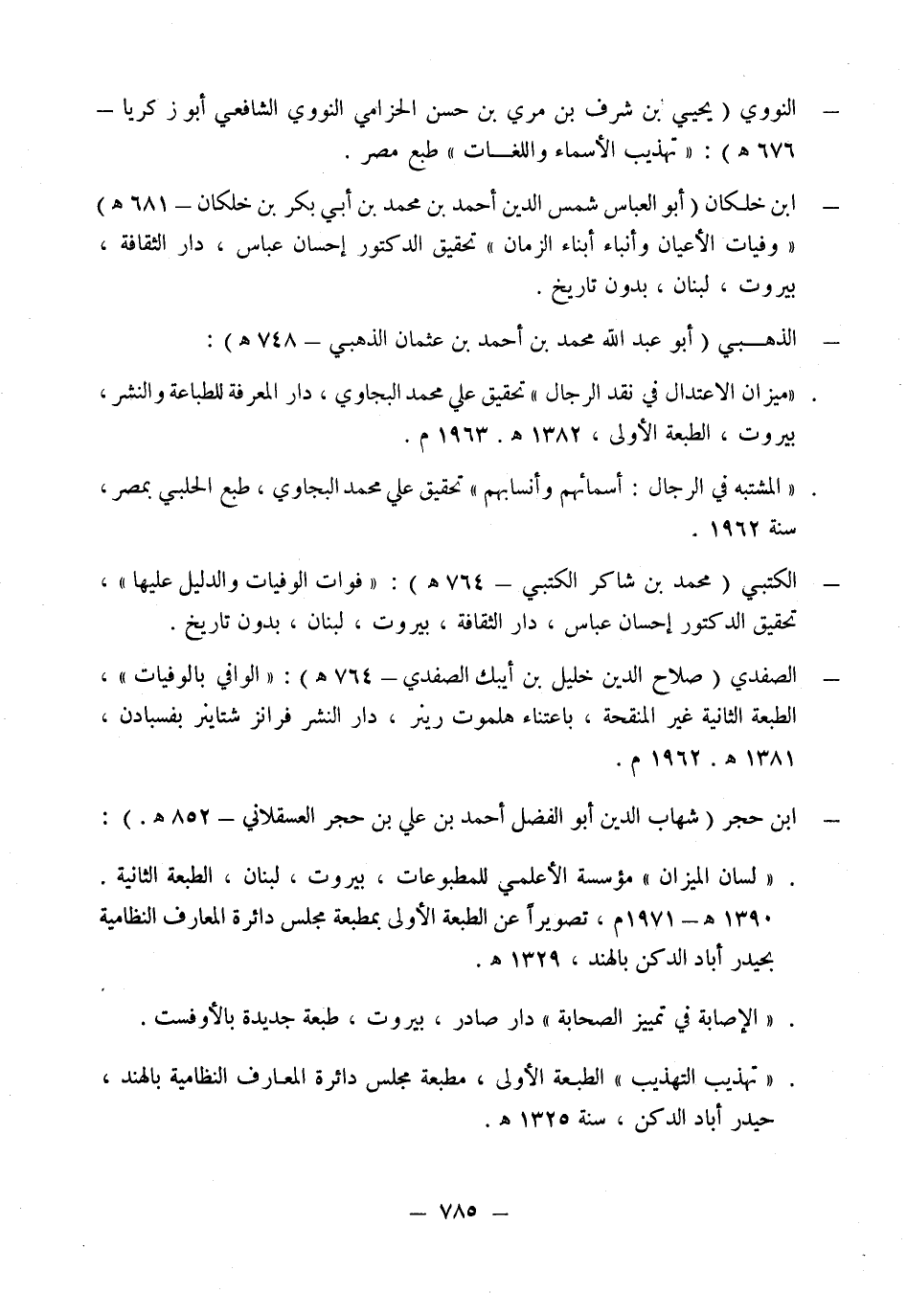 - "تهذيب التهذيب" الطبعة الأولى، مطبعة مجلس دائرة المعارف النظامية بالهند، حيدر أباد الدكن، سنة 1325 هـ.