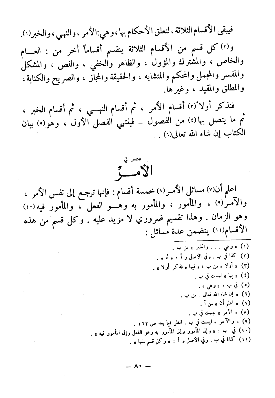 اعلم أن (¬7) مسائل الأمر (¬8) خمسة أقسام: فإنها ترجع إلى نفس الأمر، والآمر (¬9)، والمأمور، والمأمور به وهو الفعل، والمأمور فيه (¬10) وهو الزمان. وهذا تقسيم ضروري لا مزيد عليه. وكل قسم من هذه الأقسام (¬11) يتضمن عدة مسائل: