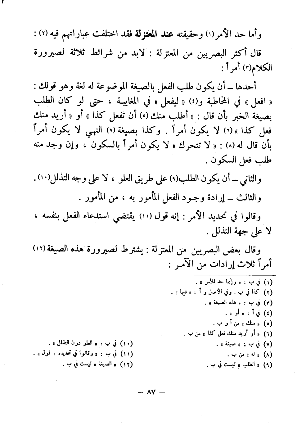 وأما حد الأمر (¬1) وحقيقته عند المعتزلة فقد اختلفت عباراتهم فيه (¬2):