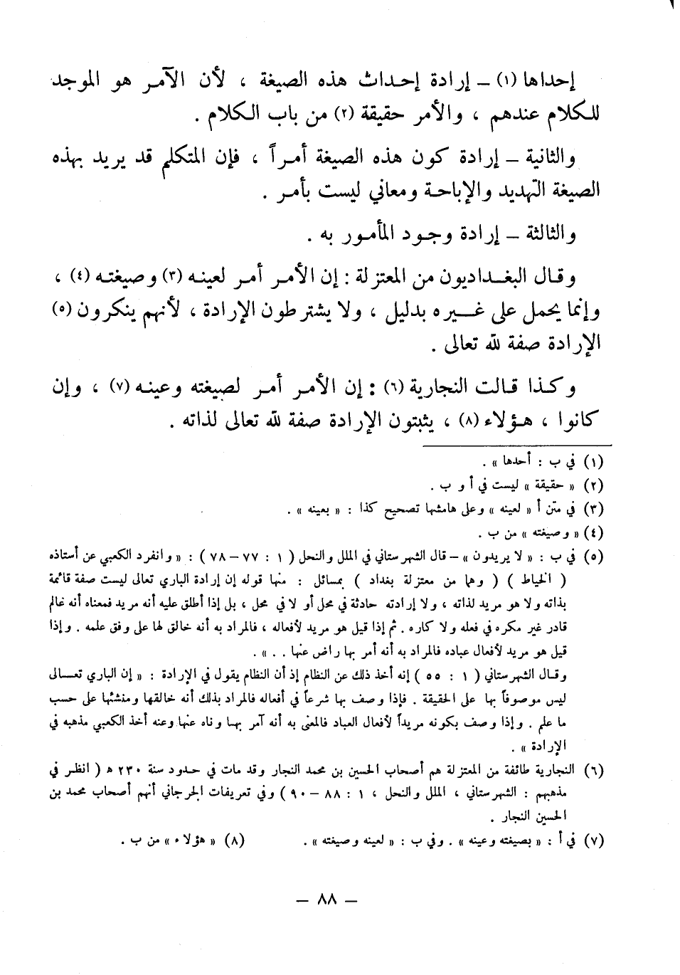 (¬6) النجارية طائفة من المعتزلة هم أصحاب الحسين بن محمد النجار وقد مات في حدود سنة 230 هـ (انظر في مذهبهم: الشهرستاني، الملل والنحل، 1: 88 - 90) وفي تعريفات الجرجاني أنهم أصحاب محمد بن الحسين النجار.