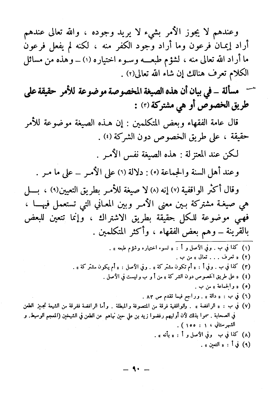 وعندهم لا يجوز الأمر بشيء لا يريد وجوده، والله تعالى عندهم أراد إيمان فرعون وما أراد وجود الكفر منه، لكنه لم يفعل فرعون ما أراد الله تعالى منه، لشؤم طبعه وسوء اختياره (¬1) - وهذه من مسائل الكلام تعرف هنالك إن شاء الله تعالى (¬2).