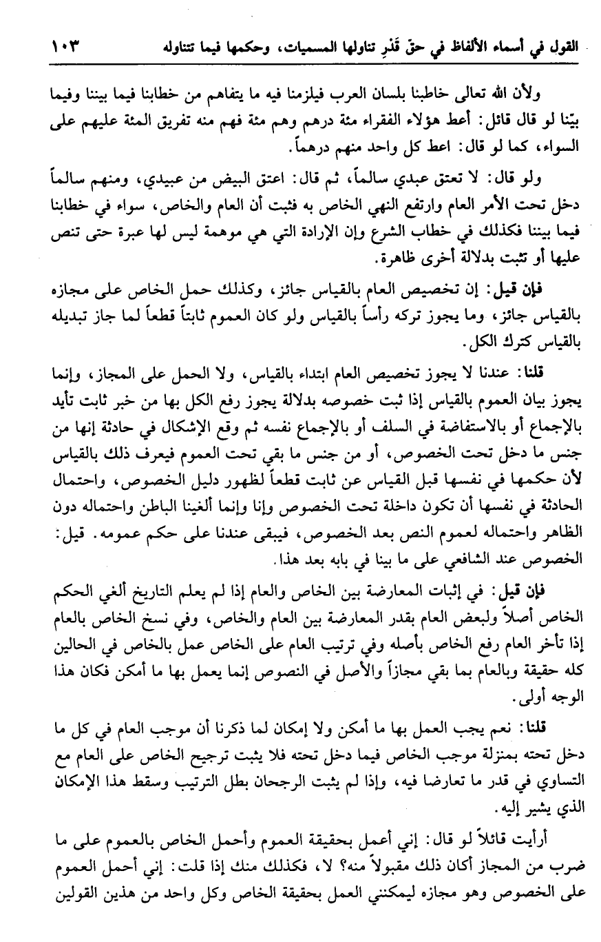 أرأيت قائلاً لو قال: إني أعمل بحقيقة العموم وأحمل الخاص بالعموم على ما ضرب من المجاز أكان ذلك مقبولاً منه؟ لا، فكذلك منك إذا قلت: إني أحمل العموم على الخصوص وهو مجازه ليمكنني العمل بحقيقة الخاص وكل واحد من هذين القولين