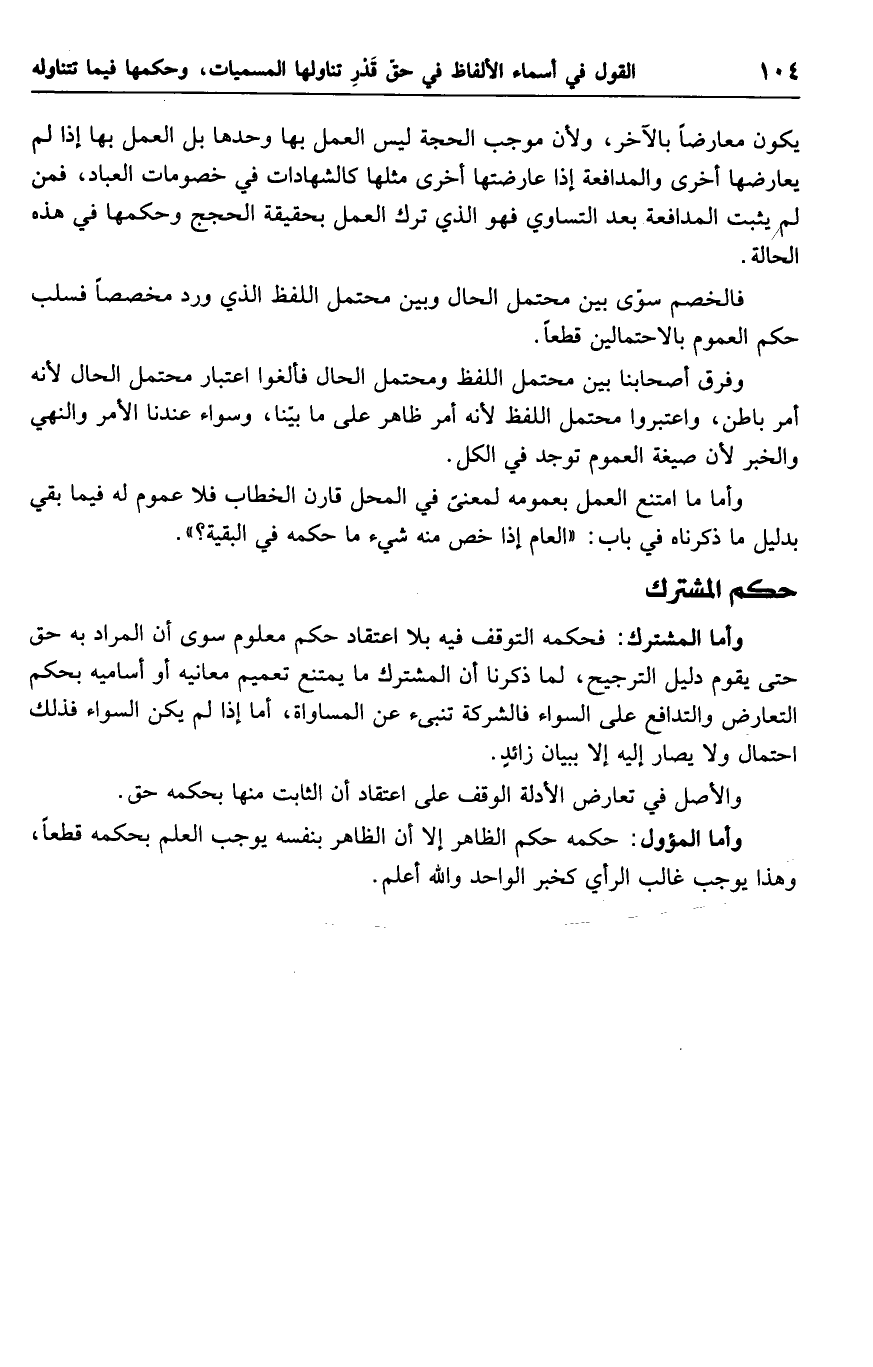 وأما المشترك: فحكمه التوقف فيه بلا اعتقاد حكم معلوم سوى أن المراد به حق حتى يقوم دليل الترجيح، لما ذكرنا أن المشترك ما يمتنع تعميم معانيه أو أساميه بحكم التعارض والتدافع على السواء فالشركة تنبئ عن المساواة، أما إذا لم يكن السواء فذلك احتمال ولا يصار إليه إلا ببيان زائد.