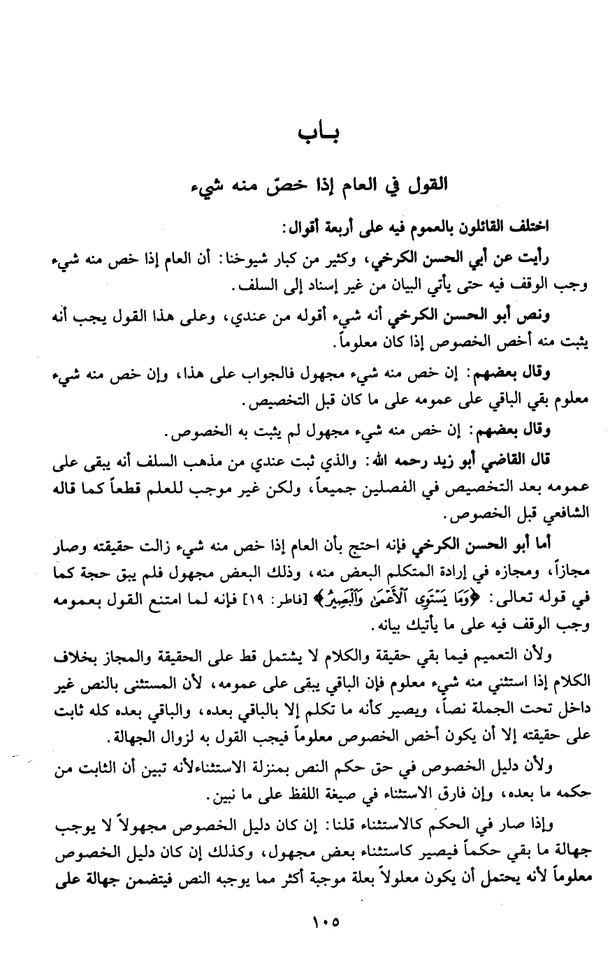 رأيت عن أبي الحسن الكرخي، وكثير من كبار شيوخنا: أن العام إذا خص منه شيء وجب الوقف فيه حتى يأتي البيان من غير إسناد إلى السلف.