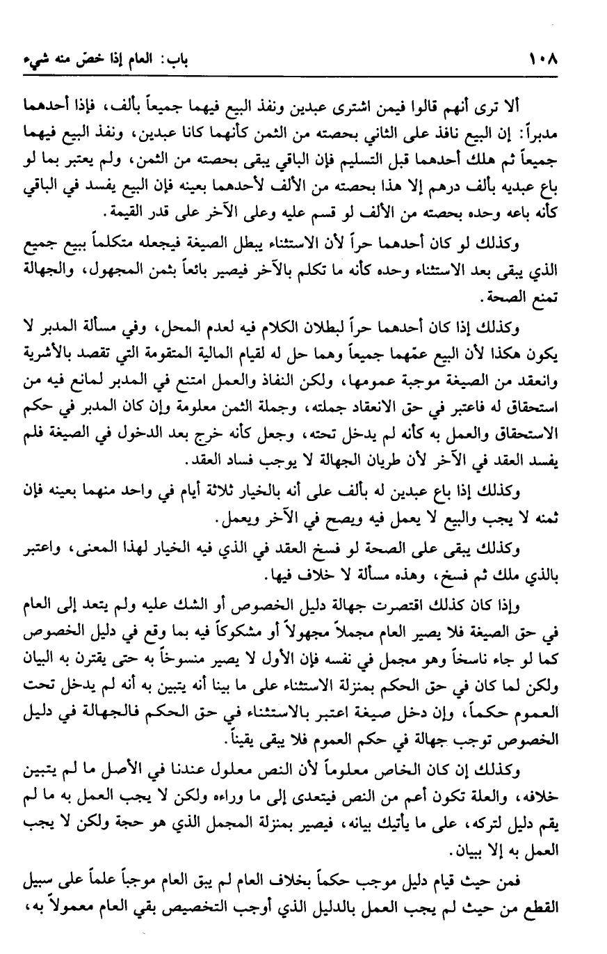 وكذلك إن كان الخاص معلوماً لأن النص معلول عندنا في الأصل ما لم يتبين خلافه، والعلة تكون أعم من النص فيتعدى إلى ما وراءه ولكن لا يجب العمل به ما لم يقم دليل لتركه، على ما يأتيك بيانه، فيصير بمنزلة المجمل الذي هو حجة ولكن لا يجب العمل به إلا ببيان.