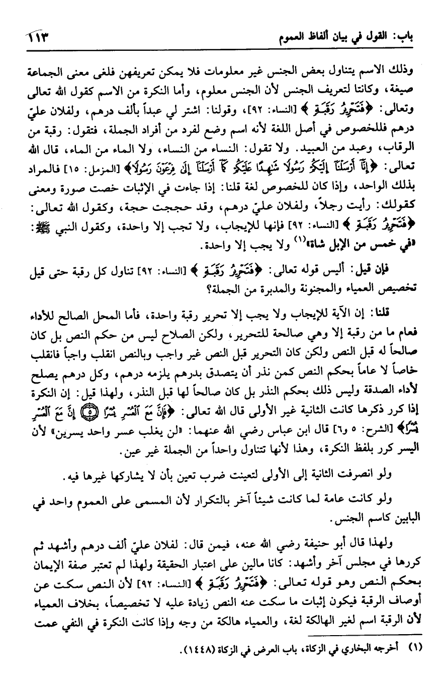 وذلك الاسم يتناول بعض الجنس غير معلومات فلا يمكن تعريفهن فلغى معنى الجماعة صيغة، وكانتا لتعريف الجنس لأن الجنس معلوم، وأما النكرة من الاسم كقول الله تعالى وتعالى: {فتحرير رقبة}، وقولنا: اشتر لي عبداً بألف درهم، ولفلان علي درهم فللخصوص في أصل اللغة لأنه اسم وضع لفرد من أفرد الجملة، فتقول: رقبة من الرقاب، وعبد من العبيد. ولا تقول: النساء من النساء، ولا الماء من الماء، قال الله تعالى: {إنا أرسلنا إليكم رسولاً شاهداً عليكم كما أرسلنا إلى فرعون رسولاً} فالمراد بذلك الواحد، وإذا كان للخصوص لغة قلنا: إذا جاءت في الإثبات خصت صورة ومعنى كقولك: رأيت رجلاً، ولفلان علي درهم، وقد حججت حجة، وكقول الله تعالى: {فتحرير رقبة} فإنها للإيجاب، ولا تجب إلا واحدة، كقول النبي صلى الله عليه وسلم: "في خمس من الإبل شاة" ولا يجب إلا واحدة.