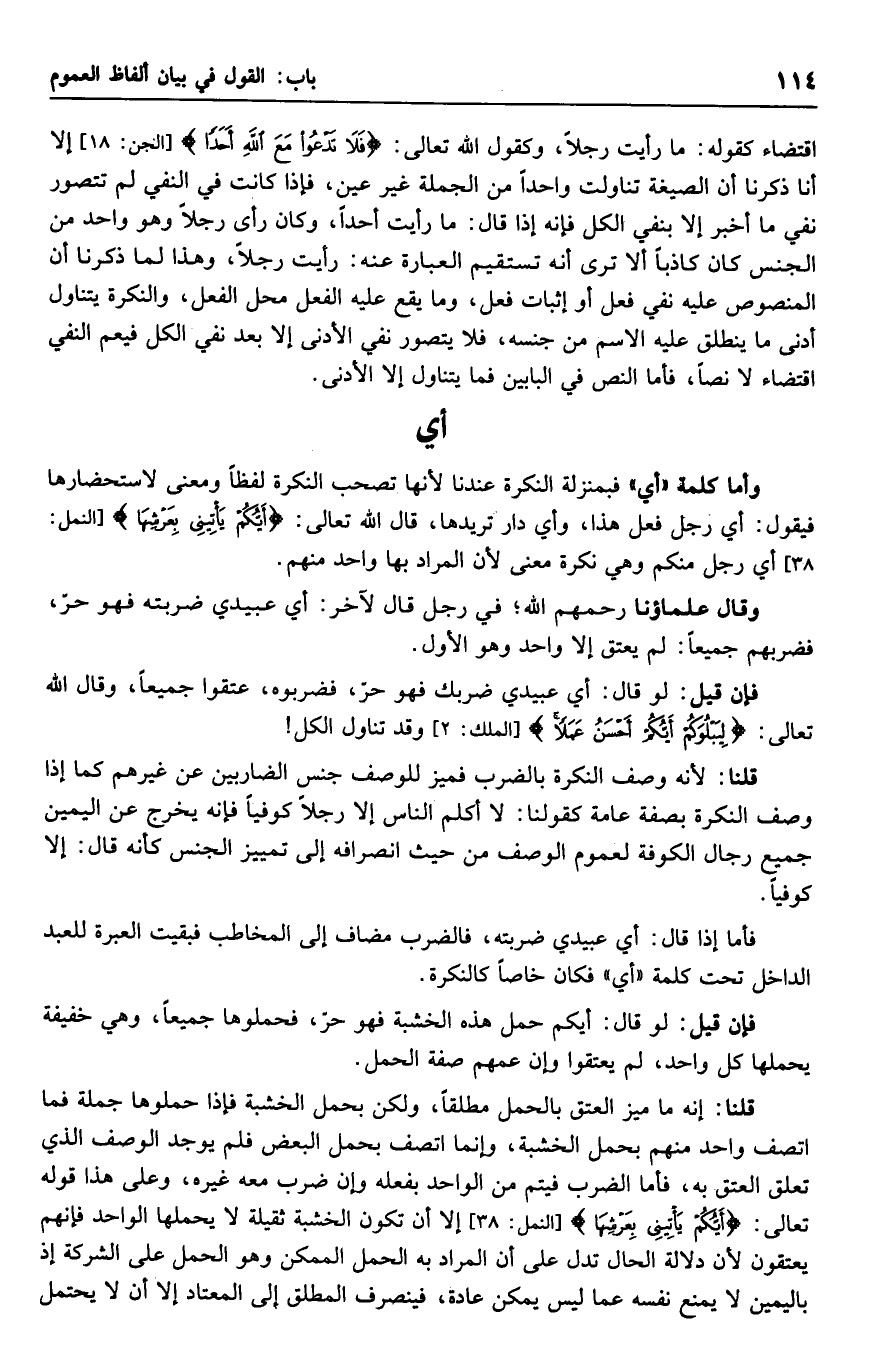 وأما كلمة "أي" فبمنزلة النكرة عندنا لأنها تصحب النكرة لفظاً ومعنى لاستحضارها فيقول: أي رجل فعل هذا، وأي دار تريدها، قال الله تعالى: {أيكم يأتيني بعرشها} أي رجل منكم وهي نكرة معنى لأن المراد بها واحد منهم.