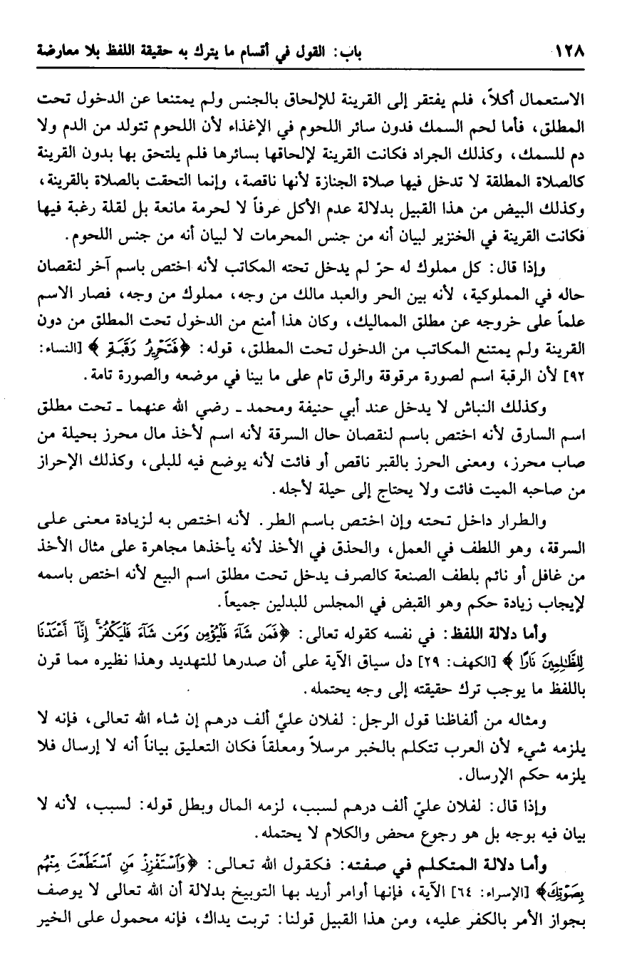 الاستعمال أكلاً، فلم يفتقر إلى القرينة للإلحاق بالجنس ولم يمتنعا عن الدخول تحت المطلق، فأما لحم السمك فدون سائر اللحوم في الإغذاء لأن اللحوم تتولد من الدم ولا دم للسمك، وكذلك الجراد فكانت القرينة لإلحاقها بسائرها فلم يلتحق بها بدون القرينة كالصلاة المطلقة لا تدخل فيها صلاة الجنازة لأنها ناقصة، وإنما التحقت بالصلاة بالقرينة، وكذلك البيض من هذا القبيل بدلالة عدم الأكل عرفاً لا لحرمة مانعة بل لقلة رغبة فيها فكانت القرينة في الخنزير لبيان أنه من جنس المحرمات لا لبيان أنه من جنس اللحوم.