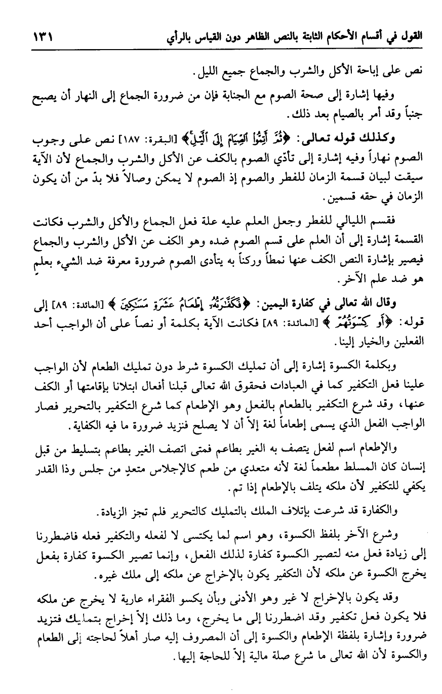 فقسم الليالي للفطر وجعل العلم عليه علة فعل الجماع والأكل والشرب فكانت القسمة إشارة إلى أن العلم على قسم الصوم ضده وهو الكف عن الأكل والشرب والجماع فيصير بإشارة النص الكف عنها نمطاً وركناً به يتأدى الصوم ضرورة معرفة ضد الشيء بعلم هو ضد علم الآخر.