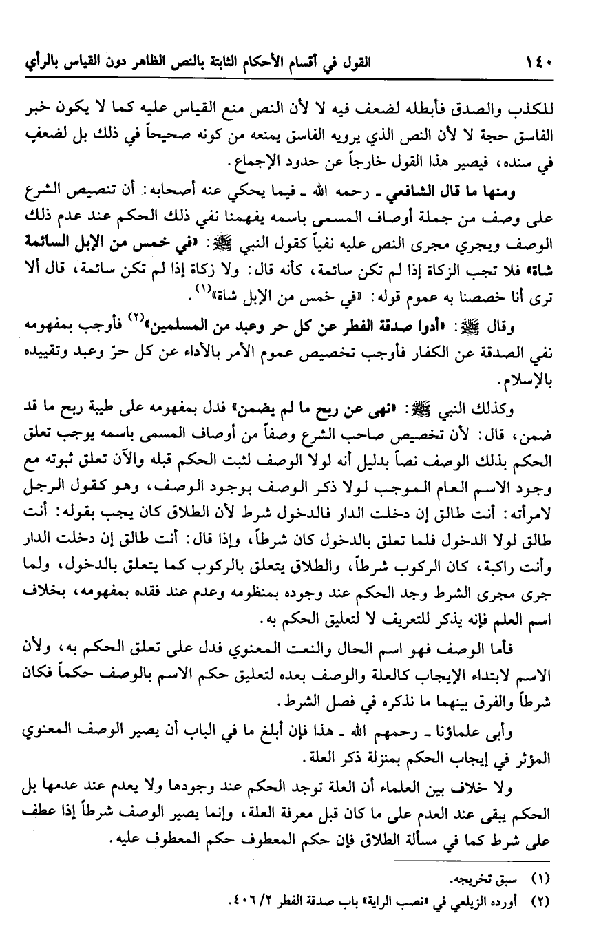 ومنها ما قال الشافعي- رحمه الله- فيما يحكي عنه أصحابه: أن تنصيص الشرع على وصف من جملة أوصاف المسمى باسمه يفهمنا نفي ذلك الحكم عند عدم ذلك الوصف ويجري مجرى النص عليه نفياً كقول النبي صلى الله عليه وسلم: "في خمس من الإبل السائمة شاة" فلا تجب الزكاة إذا لم تكن سائمة، كأنه قال: ولا زكاة إذا لم تكن سائمة، قال ألا ترى أنا خصصنا به عموم قوله: "في خمس من الإبل شاة".