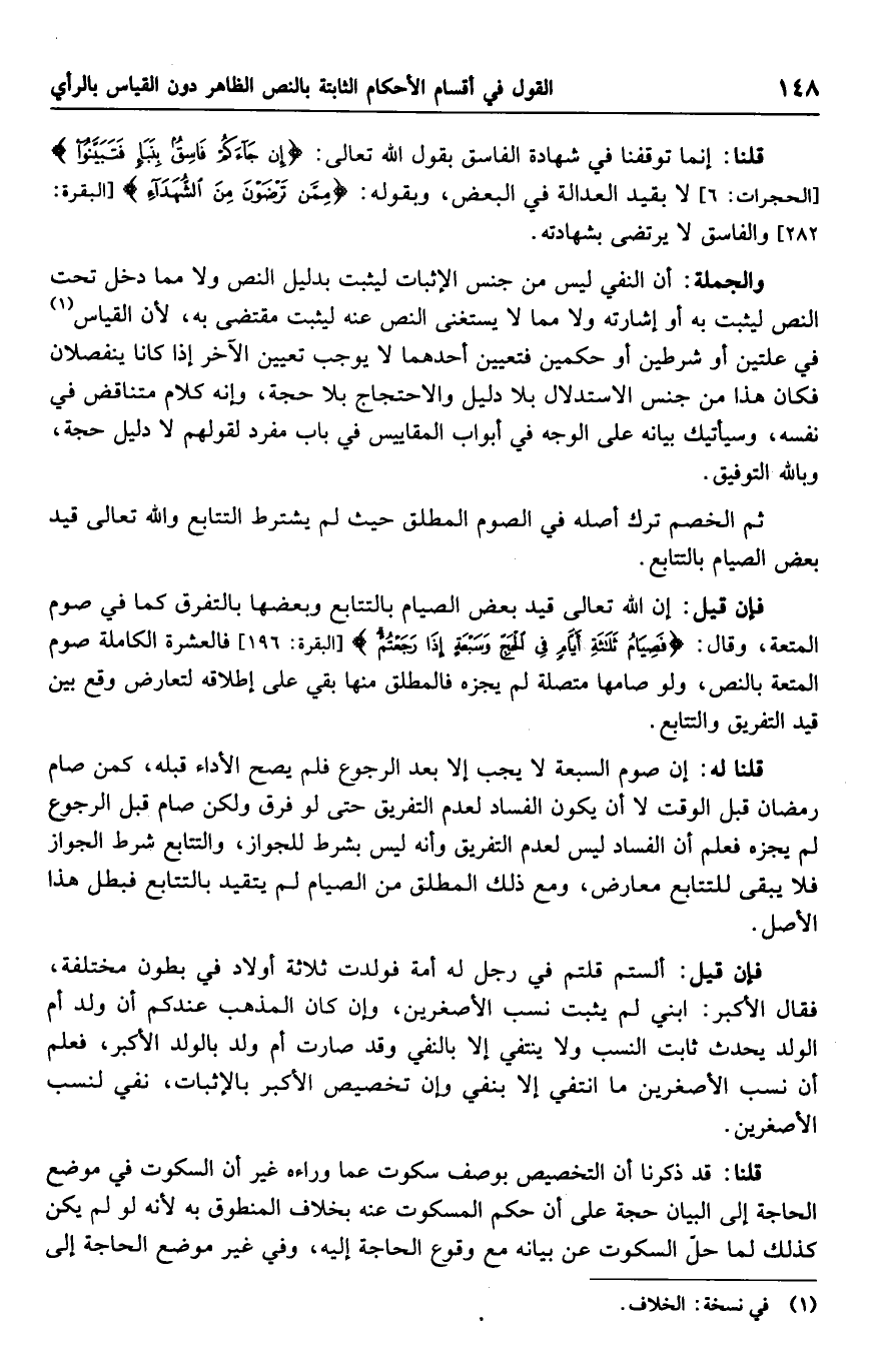 والجملة: أن النفي ليس من جنس الإثبات ليثبت بدليل النص ولا مما دخل تحت النص ليثبت به أو إشارته ولا مما لا يستغنى النص عنه ليثبت مقتضى به، لأن القياس في علتين أو شرطين أو حكمين فتعيين أحدهما لا يوجب تعيين الآخر إذا كانا ينفصلان فكان هذا من جنس الاستدلال بلا دليل والاحتجاج بلا حجة، وإنه كلام متناقض في نفسه، وسيأتيك بيانه على الوجه في أبواب المقاييس في باب مفرد لقولهم لا دليل حجة، وبالله التوفيق.