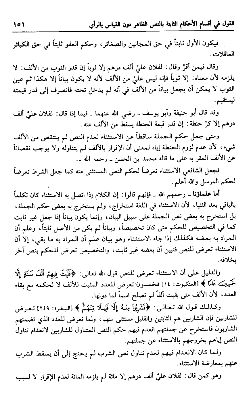 والدليل على أن الاستثناء تعرض للنص قول الله تعالى: {فلبث فيهم ألف سنة إلا خمسين عاماً} فخمسون تعرض للعدد المثبت للألف لا لحكمه مع بقاء العدد، لأن الألف متى بقيت ألفاً لم تصلح اسماً لما دونها.