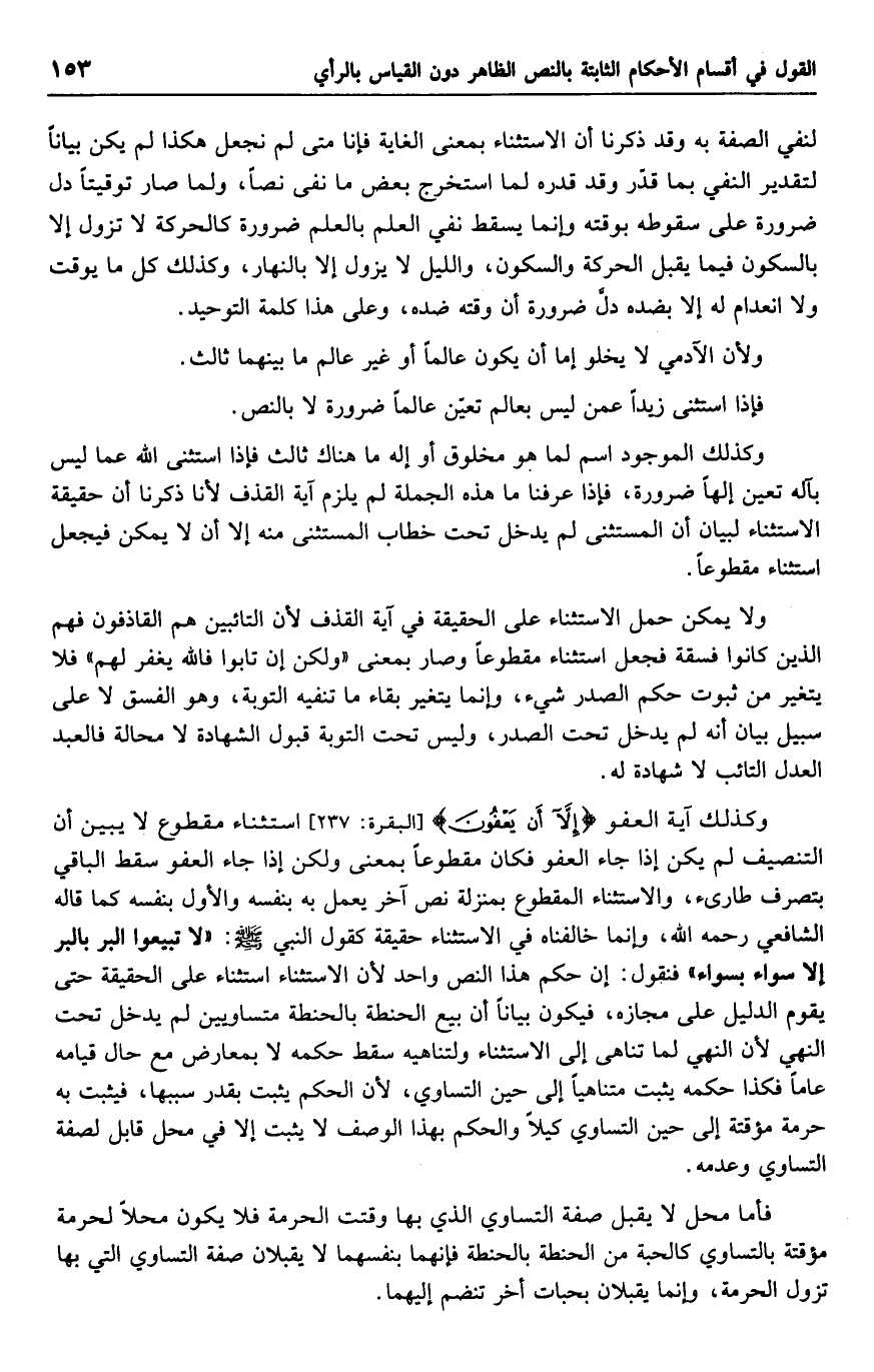 وكذلك آية العفو {إلا أن يعفون} استثناء مقطوع لا يبين أن التصنيف لم يكن إذا جاء العفو فكان مقطوعاً بمعنى ولكن إذا جاء العفو سقط الباقي بتصرف طارئ، والاستثناء المقطوع بمنزلة نص آخر يعمل به بنفسه والأول بنفسه كما قاله الشافعي رحمه الله، وإنما خالفناه في الاستثناء حقيقة كقول النبي صلى الله عليه وسلم: "لا تبيعوا البر بالبر إلا سواء بسواء" فنقول: إن حكم هذا النص واحد لأن الاستثناء استثناء على الحقيقة حتى يقوم الدليل على مجازه، فيكون بياناً أن بيع الحنطة بالحنطة متساويين لم يدخل تحت النهي لأن النهي لما تناهى إلى الاستثناء ولتناهيه سقط حكمه لا بمعارض مع حال قيامه عاماً فكذا حكمه يثبت متناهياً إلى حين التساوي، لأن الحكم يثبت بقدر سببها، فيثبت به حرمة مؤقتة إلى حين التساوي كيلاً والحكم بهذا الوصف لا يثبت إلا في محل قابل لصفة التساوي وعدمه.