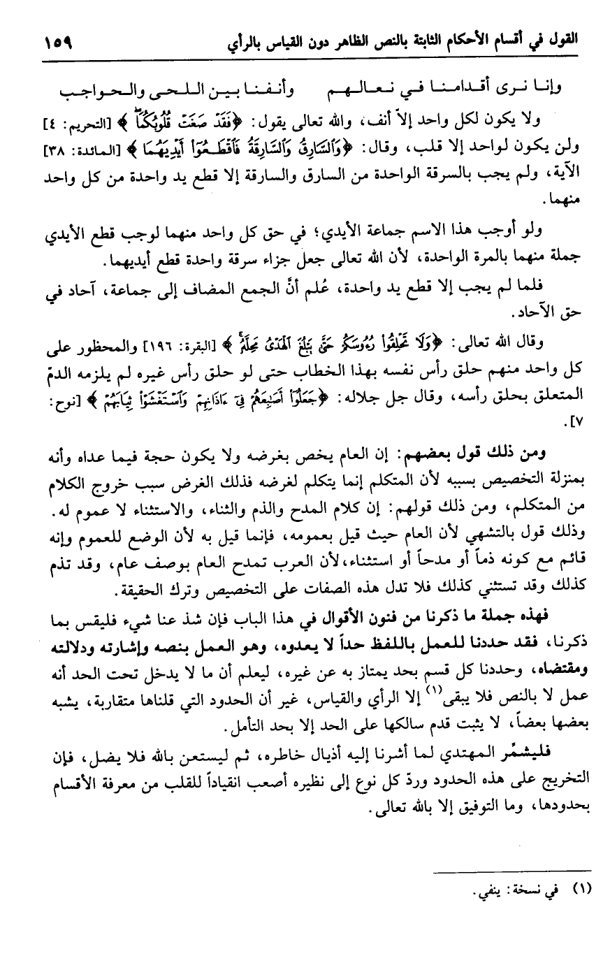 فهذه جملة ما ذكرنا من فنون الأقوال في هذا الباب فإن شذ عنا شيء فليقس بما ذكرنا، فقد حددنا للعمل باللفظ حداً لا يعدوه، وهو العمل بنصه وإشارته ودلالته ومقتضاه، وحددنا كل قسم بحد يمتاز به عن غيره، ليعلم أن ما لا يدخل تحت الحد أنه عمل لا بالنص فلا يبقى إلا الرأي والقياس، غير أن الحدود التي قلناها متقاربة، يشبه بعضها بعضاً، لا يثبت قدم سالكها على الحد إلا بحد التأمل.