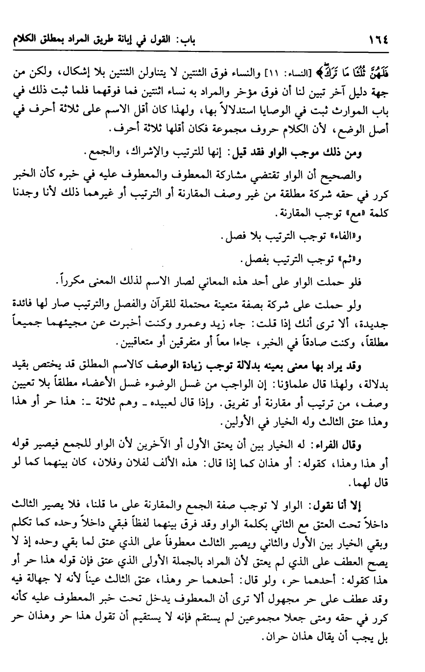 والصحيح ان الواو تقتضي مشاركة المعطوف والمعطوف عليه في خبره كأن الخبر كرر في حقه شركة مطلقة من غير وصف المقارنة أو الترتيب أو غيرهما ذلك لأنا وجدنا كلمة "مع" توجب المقارنة.
