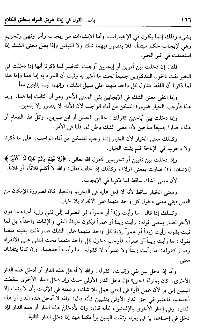 وكذلك إذا قال: ما رأيت زيداً أو عمراً، لو انصرف إلى نفي رؤية أحدهما دون الاخر لصار بمعنى قوله: رأيت زيداً أو عمراً فيكون حينئذ النفي والإثبات واحداً، بل لما ثبت بقوله رأيت زيداً أو عمراً رؤية كل واحد منهما على الشك صار ذلك بعينه منفياً بقوله: ما رأيت زيداً أو عمراً، فأوجب دخول كل واحد منهما تحت النفي على الانفراد وصار كقوله: ما رأيت زيداً ولا عمراً، لا كقوله: ما رأيت أحدهما. وإن كانا يتفقان معنى.
