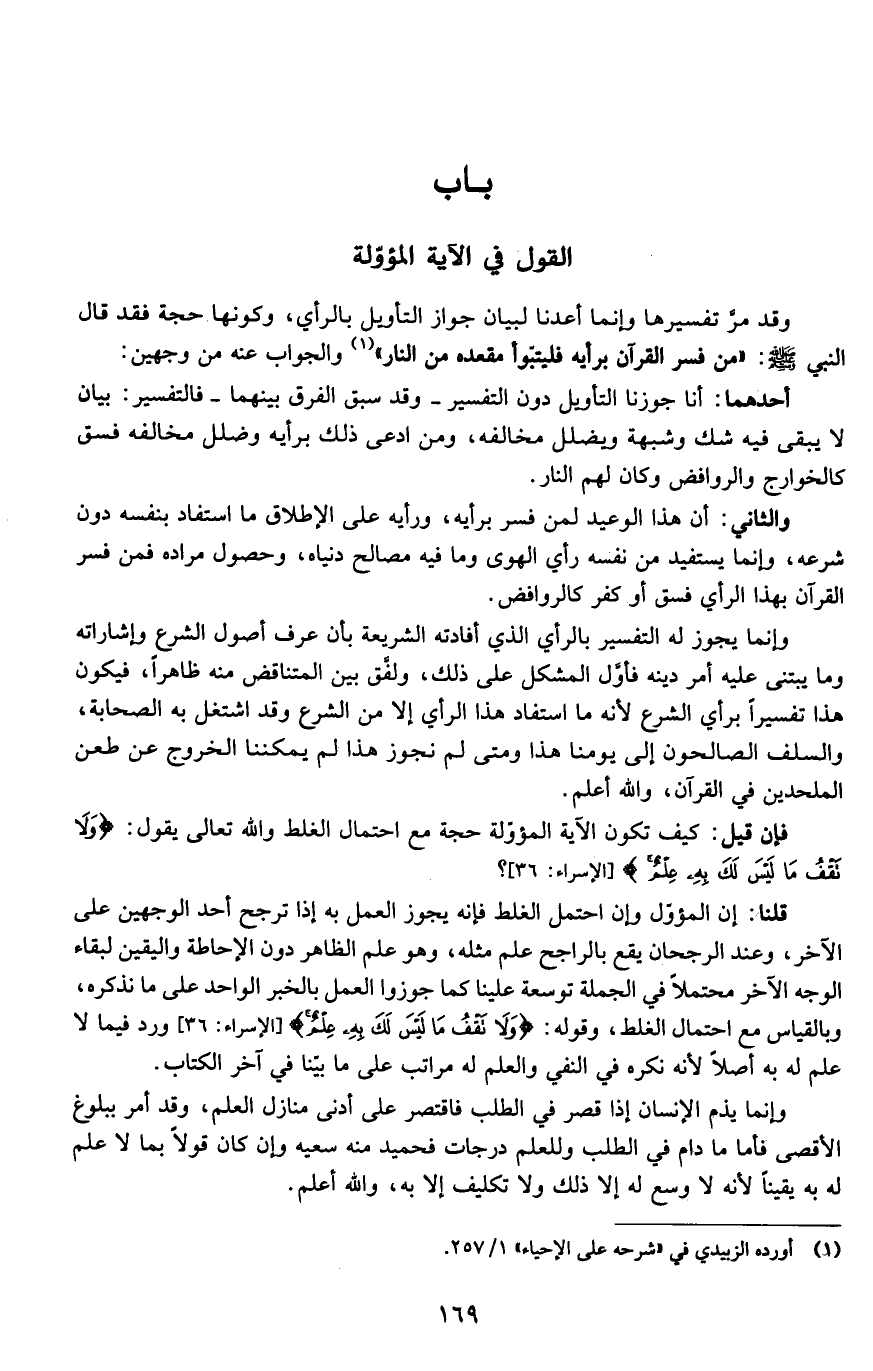 قلنا: إن المؤول وإن احتمل الغلط فإنه يجوز العمل به إذا ترجح أحد الوجهين على الآخر، وعند الرجحان يقع بالراجح علم مثله، وهو علم الظاهر دون الإحاطة واليقين لبقاء الوجه الآخر، وعند الرجحان يقع بالراجح علم مثله، وهو علم الظاهر دون الإحاطة واليقين لبقاء الوجه الآخر محتملاً في الجملة توسعة علينا كما جوزوا العمل بالخبر الواحد على ما نذكره، وبالقياس مع احتمال الغلط، وقوله: {ولا تقف ما ليس لك به علم} ورد فيما لا علم له به أصلاً لأنه نكرة في النفي والعلم له مراتب على ما بينا في آخر الكتاب.