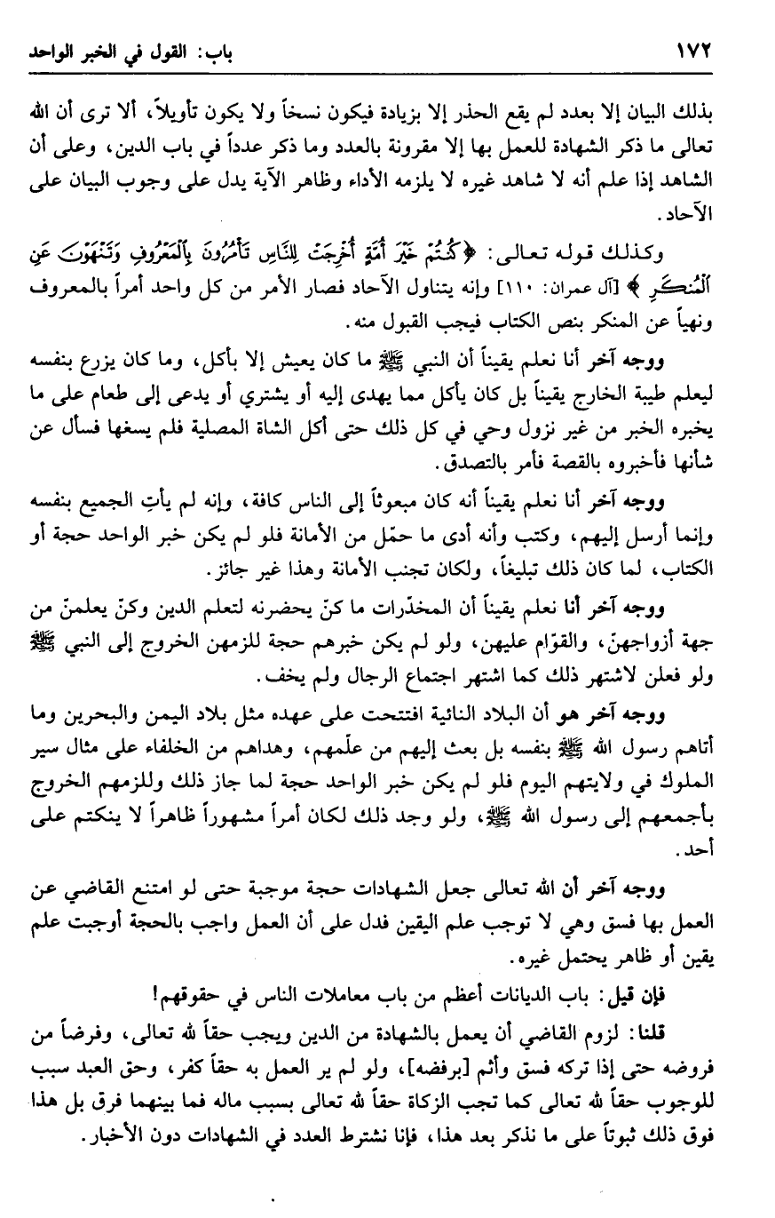 وكذلك قوله تعالى: {كنتم خير أمة اخرجت للناس تأمرون بالمعروف وتنهون عن المنكر} وإنه يتناول الآحاد فصار الأمر من كل واحد أمراً بالمعروف ونهياً عن المنكر بنص الكتاب فيجب القبول منه.