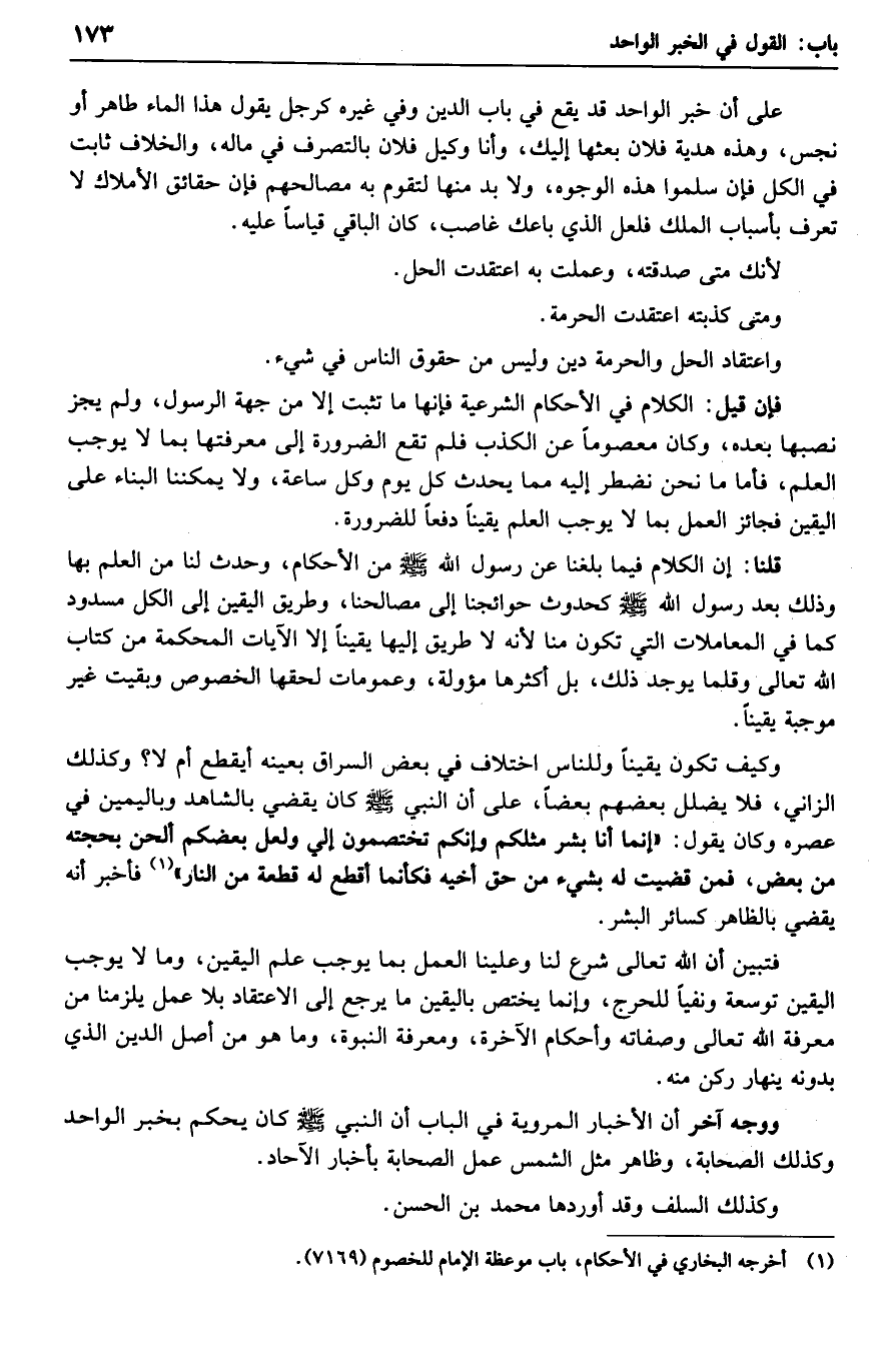وكيف تكون يقيناً وللناس اختلاف في بعض السراق بعينه أيقطع ام لا؟ وكذلك الزاني، فلا يضلل بعضهم بعضاً، على أن النبي صلى الله عليه وسلم كان يقضي بالشاهد وباليمين في عصره وكان يقول: "إنما انا بشر مثلكم وإنكم تختصمون إلي ولعل بعضكم ألحن بحجته من بعض، فمن قضيت له بشيء من حق أخيه فكأنما أقطع له قطعة من النار" فأخبر أنه يقضي بالظاهر كسائر البشر.