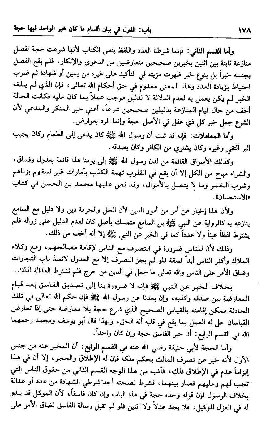 واما الحجة لأبي حنيفة رضي الله عنه في القسم الرابع: أن المخبر عنه من جنس الأول لأنه خبر عن تصرف المالك بحكم ملكه فإن له الإطلاق والحجر، إلا أن في هذا إلزاماً عدم في الإطلاق ذلك، فأشبه من هذا الوجه القسم الثاني من حقوق الناس التي تجب لهم وعليهم فصار بينهما، فشرط لصحته أحد شرطي الشهادة من عدد أو عدالة بخلاف الرسول فإن قوله وحده حجة في هذا الباب وإن كان فاسقاً، لأن الموكل قد يبدو له في العزل للوكيل، فلا يجد عدلاً ولا اثنين فلو لم تقبل رسالة الفاسق لضاق الأمر على