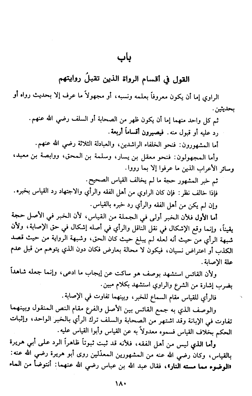 وأما الذي ليس من أهل الفقه، فلأنه قد ثبت ثبوتاً ظاهراً الرد على أبي هريرة بالقياس، وكان رضي الله عنه من المشهورين المعدلين روى أبو هريرة رضي الله عنه: "الوضوء مما مسته النار"، فقال عبد الله بن عباس رضي الله عنهما: أنتوضأ من الماء