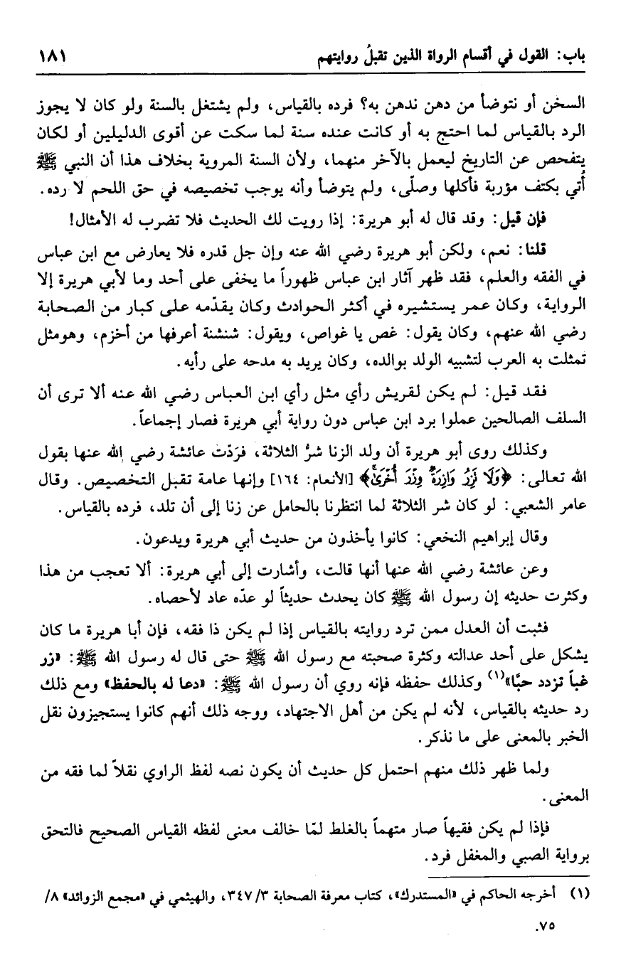 فثبت أن العدل ممن ترد روايته بالقياس إذا لم يكن ذا فقه، فإن أبا هريرة ما كان يشكل على أحد عدالته وكثرة صحبته مع رسول الله صلى الله عليه وسلم حتى قال له رسول الله صلى الله عليه وسلم: "زر غباً تزدد حباً" وكذلك حفظه فإنه روي أن رسول الله صلى الله عليه وسلم: "دعا له بالحفظ" ومع ذلك رد حديثه بالقياس، لأنه لم يكن من أهل الاجتهاد، ووجه ذلك أنهم كانوا يستجيزون نقل الخبر بالمعنى على ما نذكر.