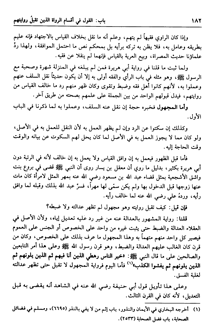 قلنا: رواية المشهور بالعدالة عنه من غير رد عليه تعديل إياه، ولأن الأصل في العقلاء العدالة والضبط حتى يثبت غيره من واحد على الخصوص أو الجنس على العموم فيصير كل واحد منهم متهماً به وهذا المجهول ما عرف بذلك على الخصوص، وكان من قرن كان الغالب عليهم العدالة والضبط، وهو قرن رسول الله صلى الله عليه وسلم وعلى هذا أمر التابعين والصالحين على ما قال النبي صلى الله عليه وسلم: "خير الناس رهطي الذين أنا فيهم ثم الذين يلونهم ثم الذين يلونهم ثم يفشوا الكذب" فأما اليوم فرواية المجهول لا تقبل حتى تظهر عدالته لغلبة الفسق.