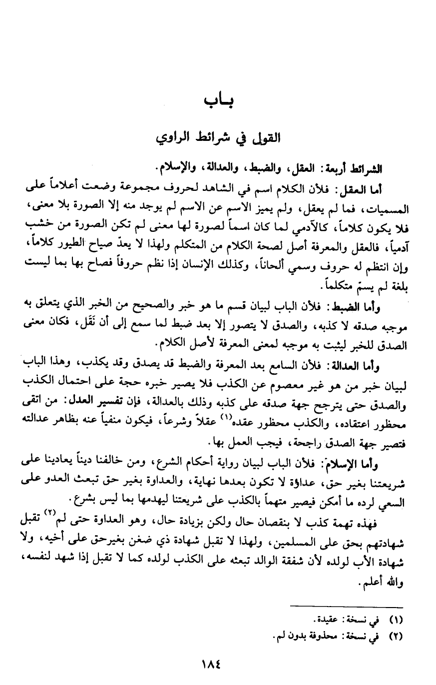 الشرائط أربعة: العقل، والضبط، والعدالة، والإسلام.