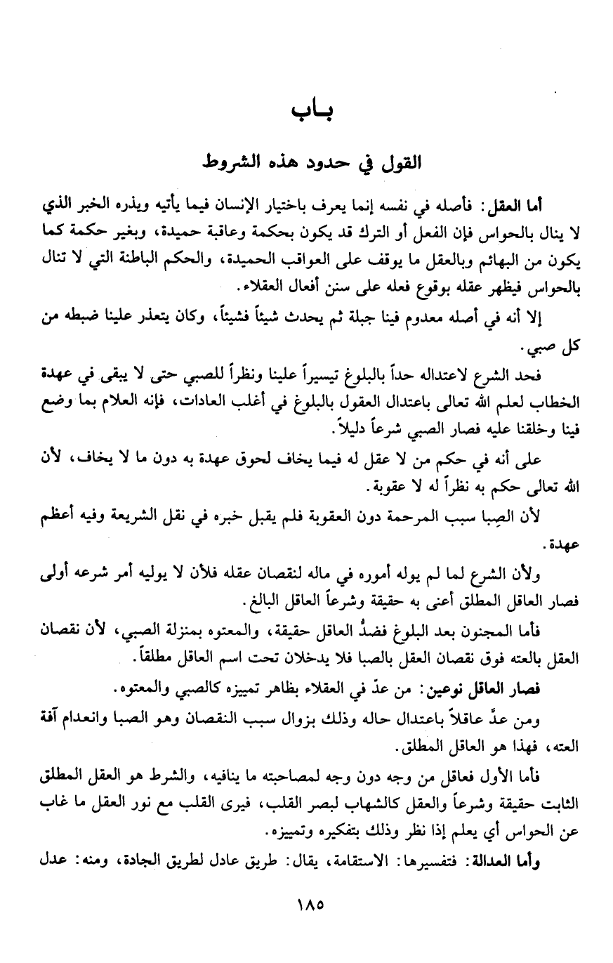ومن عد عاقلاً باعتدال حاله وذلك بزوال سبب النقصان وهو الصبا وانعدام آفة العته، فهذا هو العاقل المطلق.