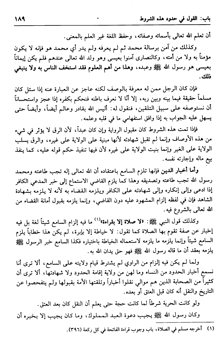 وكذلك قول النبي صلى الله عليه وسلم: "لا صلاة إلا بقراءة" ما فيه إلزام السامع شيئاً لغة بل فيه إخبار عن صفة تقوم بها الصلاة كما تقول: لا خياطة إلا بإبرة، لم يكن هذا خطاباً يلزم السامع شيئا وإنما يلزمه ما يلزمه لاستعماله الخياطة باختياره فكذا السامع خبر الرسول صلى الله عليه وسلم يلزمه بعقد أن ما قاله رسول الله صلى الله عليه وسلم فهو حق يدان الله به.