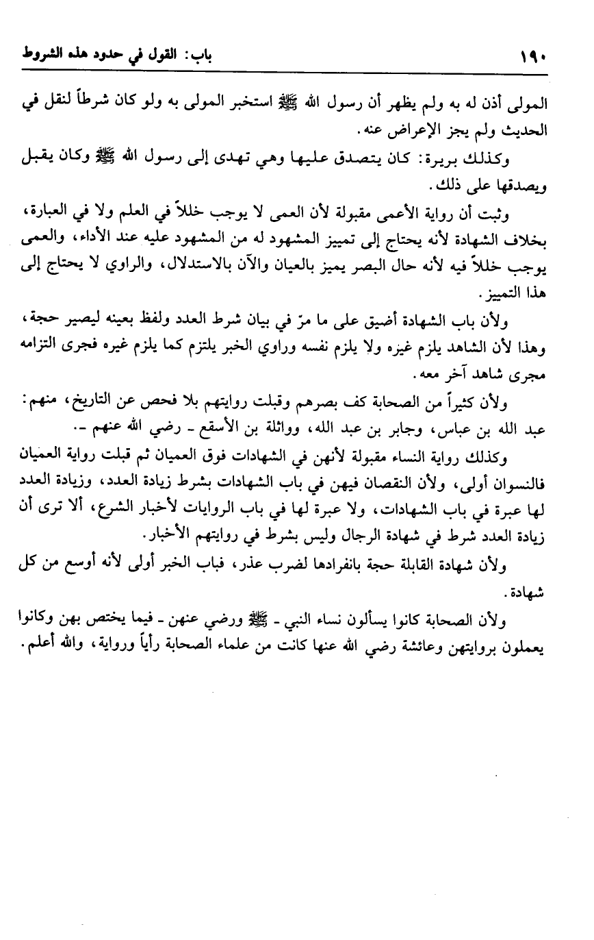 وثبت أن رواية الأعمى مقبولة لأن العمى لا يوجب خللاً في العلم ولا في العبارة، بخلاف الشهادة لأنه يحتاج إلى تمييز المشهود له من المشهود عليه عند الأداء، والعمى يوجب خللاً فيه لأنه حال البصر يميز بالعيان والآن بالاستدلال، والراوي لا يحتاج إلى هذا التمييز.