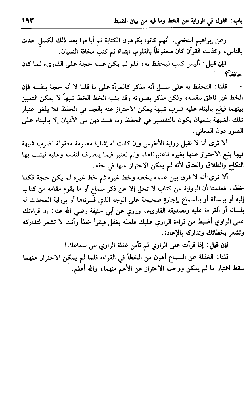وعن إبراهيم النخعي: أنهم كانوا يكرهون الكتابة ثم أباحوا بعد ذلك لكسل حدث بالناس، وكذلك القرآن كان محفوظاً بالقلوب ابتداء ثم كتب مخافة النسيان.