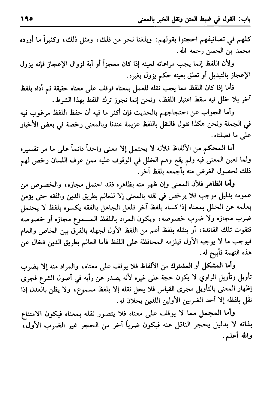 وأما المشكل أو المشترك من الألفاظ فلا يوقف على معناه، والمراد منه إلا بضرب تأويل وتأويل الراوي لا يكون حجة على غيره لأنه يصدر عن رأيه في أصول الشرع فجرى إظهار المعنى بالتأويل مجرى القياس فلا يحل نقله إلا بلفظ مسموع، ولا يظن بالعدل إذا نقل بلفظه إلا أحد الضربين الأولين اللذين يحلان له.