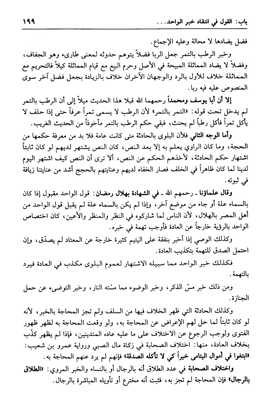 إلا أن أبا يوسف ومحمداً رحمهما الله قبلا هذا الحديث ميلاً إلى أن الرطب بالتمر لم يدخل تحت قوله: "التمر بالتمر" لأن الرطب لا يسمى تمراً عرفاً حتى إذا حلف لا يأكل تمراً فأكل رطباً لم يحنث، فبقي حكم الرطب بالتمر مأخوذاً من الحديث الغريب.