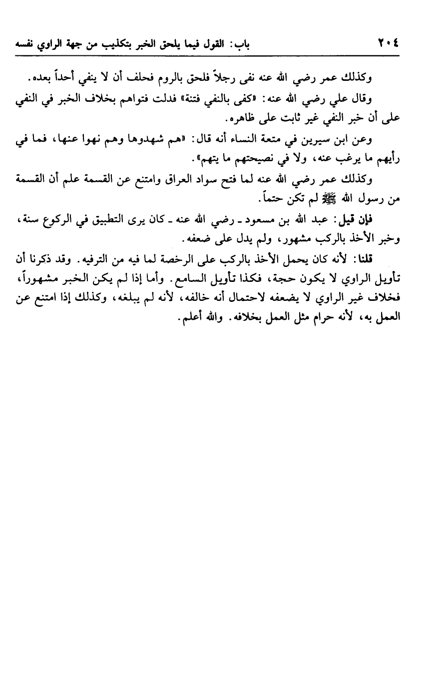 قلنا: لأنه كان يحمل الأخذ بالركب على الرخصة لما فيه من الترفيه. وقد ذكرنا أن تأويل الراوي لا يكون حجة، فكذا تأويل السامع. وأما إذا لم يكن الخبر مشهورًا، فخلاف غير الراوي لا يضعفه لاحتمال أنه خالفه، لأنه لم يبلغه، وكذلك إذا امتنع عن العمل به، لأنه حرام مثل العمل بخلافه. والله أعلم.