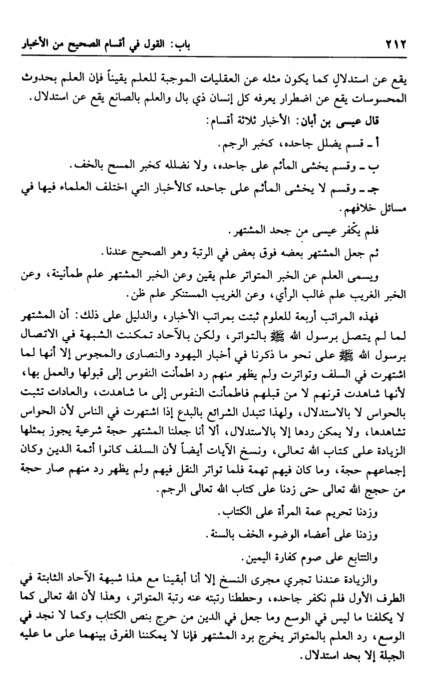 فهذه المراتب أربعة للعلوم ثبتت بمراتب الأخبار، والدليل على ذلك: أن المشتهر لما لم يتصل برسول الله صلى الله عليه وسلم بالتواتر، ولكن بالآحاد تمكنت الشبهة في الاتصال برسول الله صلى الله عليه وسلم على نحو ما ذكرنا في أخبار اليهود والنصارى والمجوس إلا أنها لما اشتهرت في السلف وتواترت ولم يظهر منهم رد اطمأنت النفوس إلى قبولها والعمل بها، لأنها شاهدت قرنهم لا من قبلهم فاطمأنت النفوس إلى ما شاهدت، والعادات تثبت بالحواس لا بالاستدلال، ولهذا تتبدل الشرائع بالبدع إذا اشتهرت في الناس لأن الحواس تشاهدها، ولا يمكن ردها إلا بالاستدلال، ألا أنا جعلنا المشتهر حجة شرعية يجوز بمثلها الزيادة على كتاب الله تعالى، ونسخ الآيات أيضًا لأن السلف كانوا أئمة الدين وكان إجماعهم حجة، وما كان فيهم تهمة فلما تواتر النقل فيهم ولم يظهر رد منهم صار حجة من حجج الله تعالى حتى زدنا على كتاب الله تعالى الرجم.