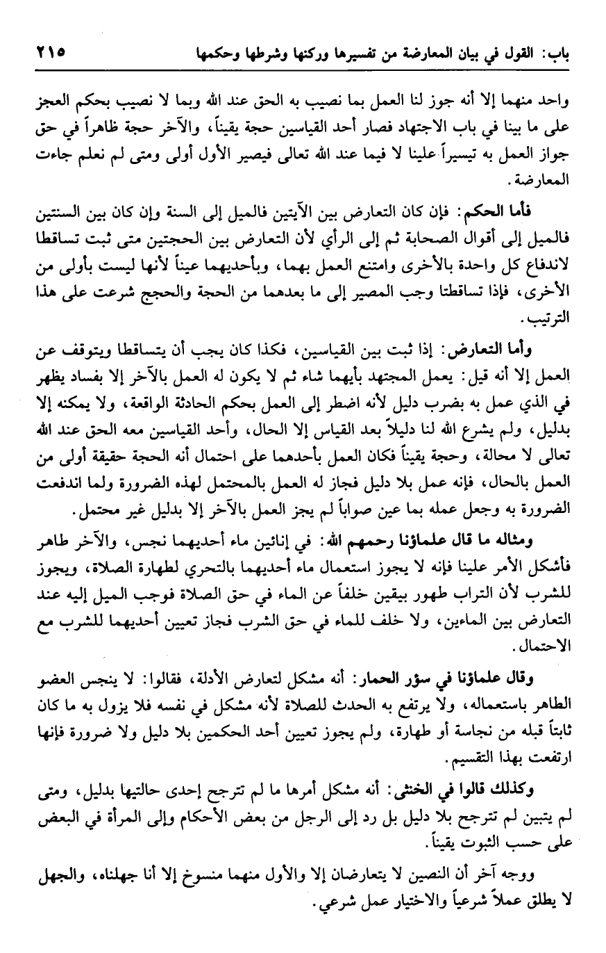 ووجه آخر أن النصين لا يتعارضان إلا والأول منهما منسوخ إلا أنا جهلناه، والجهل لا يطلق عملًا شرعيًا والاختيار عمل شرعي.