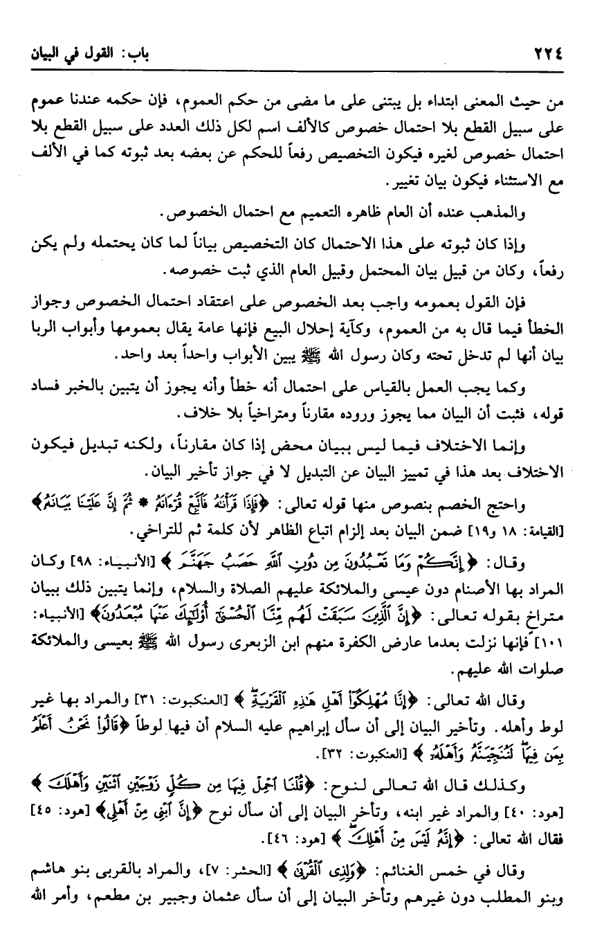 وقال الله تعالي: {إنا مهلكوا أهل هذه القرية} والمراد بها غير لوط وأهله. وتأخير البيان إلى أن سأل إبراهيم عليهم السلام أن فيها لوطًا {قالوا نحن أعلم بمن فيها لننجينه وأهله}.