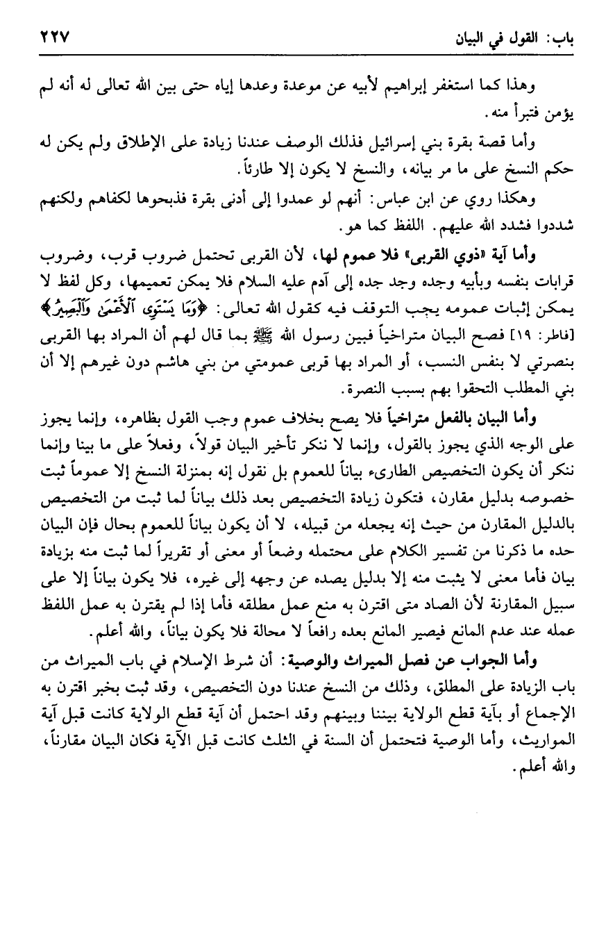 وأما الجواب عن فصل الميراث والوصية: أن شرط الإسلام في باب الميراث من باب الزيادة على المطلق، وذلك من النسخ عندنا دون التخصيص، وقد ثبت بخبر اقترن به الإجماع أو بآية قطع الولاية بيننا وبينهم وقد احتمل أن آية قطع الولاية كانت قبل آية المواريث، وأما الوصية فتحتمل أن السنة في الثلث كانت قبل الآية فكان البيان مقارنًا، والله أعلم.