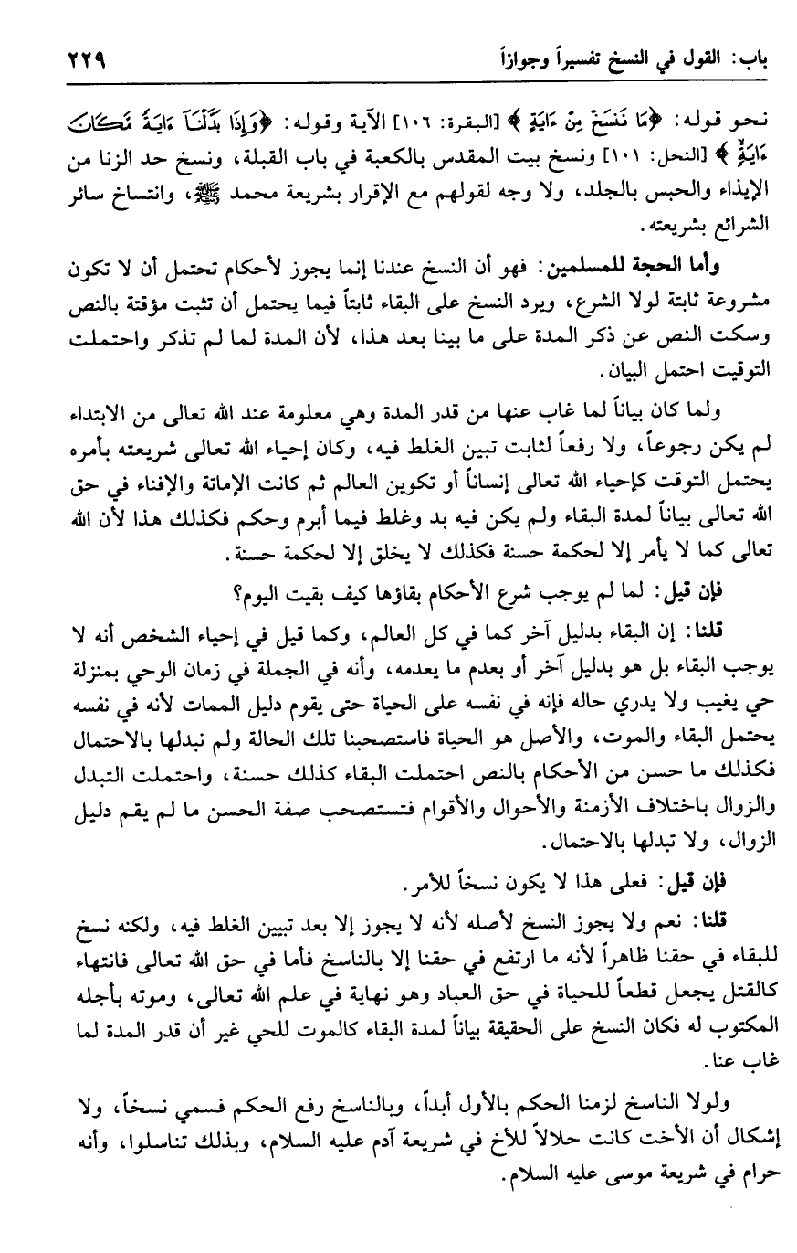 وأما الحجة للمسلمين: فهو أن النسخ عندنا إنما يجوز لأحكام تحتمل أن لا تكون مشروعة ثابتة لولا الشرع, ويرد النسخ علي البقاء ثابتًا فيما يحتمل أن تثبت مؤقتة بالنص وسكت النص عن ذكر المدة على ما بيننا بعد هذا, لأن المدة لما لم تذكر واحتملت البيان.