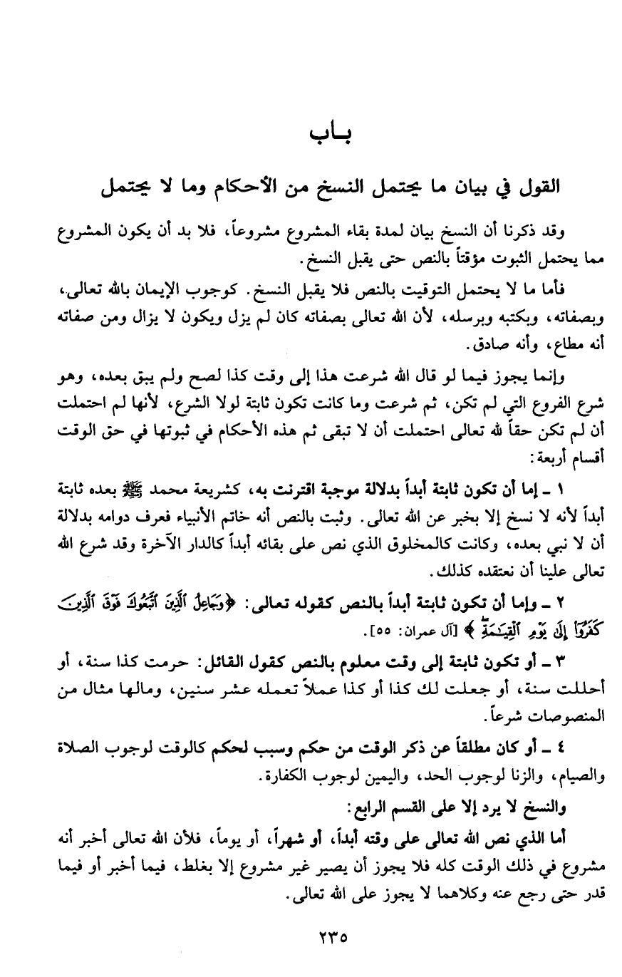 القول في البيان ما يحتمل النسخ من الأحكام وما لا يحتمل