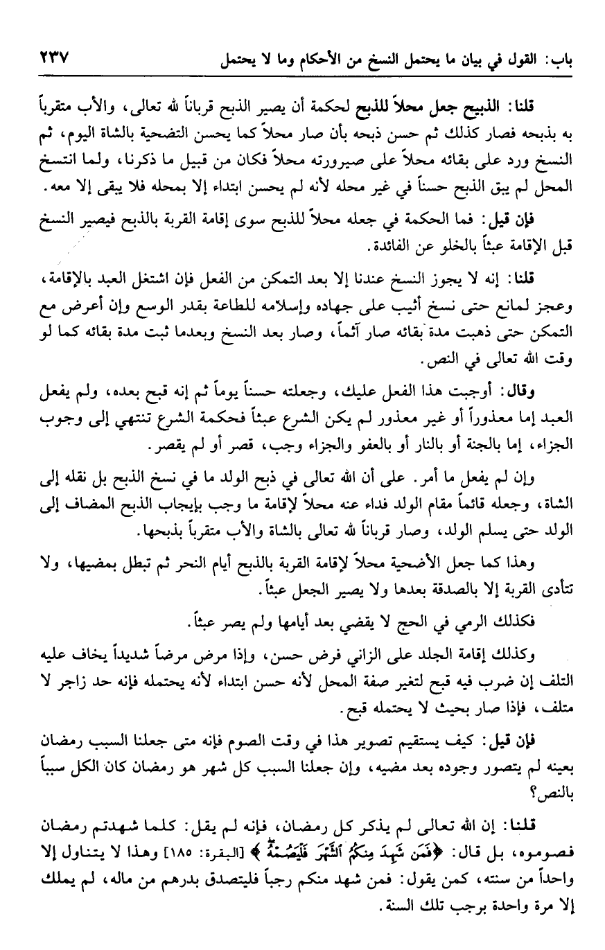قلنا: الذبيح جعل محلًا للذبح لحكمة أن يصير الذبح قربانًا لله تعالى, والأب متقربًا به بذبحه فصار كذلك ثم حسن ذبحه بأن صار محلًا كما يحسن التضحية بالشاة اليوم, ثم النسخ ورد على بقائه محلًا على صيرورته محلًا فكان من قبيل ما ذكرنا, ولما انتسخ المحل لم يبق الذبح حسنًا في غير محله لأنه لم يحسن ابتداء إلا بمحله فلا يبقى إلا معه.