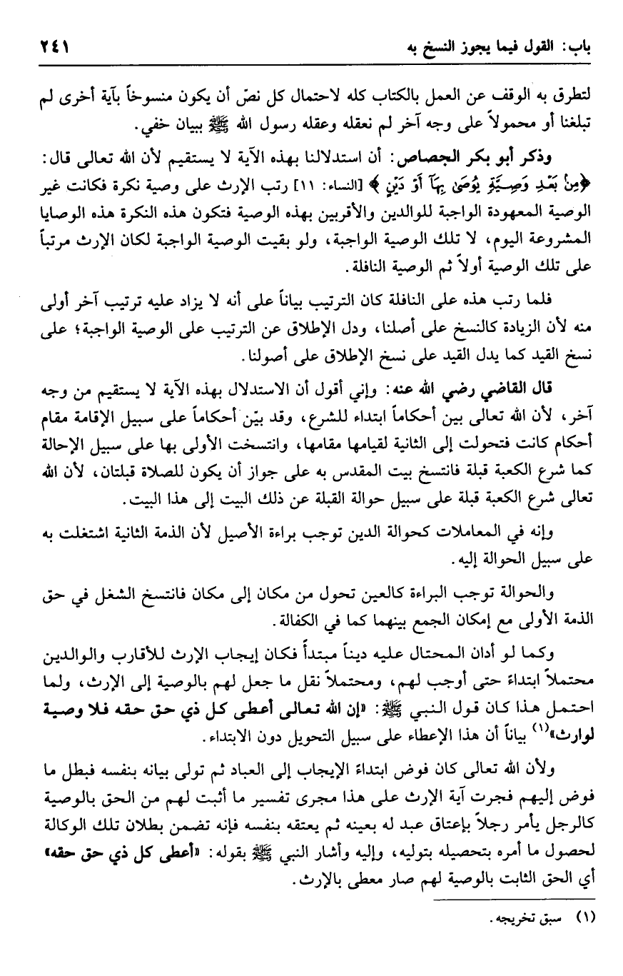 وذكر أبو بكر الجصاص: أن استدلالنا بهذه الآية لا يستقيم لأن الله تعالى قال: {من بعد وصية يوصى بها أو دين} رتب الإرث على وصية نكرة فكانت غير الوصية المعهودة الواجبة للوالدين والأقربين بهذه الوصية فتكون هذه النكرة هذه الوصايا المشروعة اليوم، لا تلك الوصية الواجبة، ولو بقيت الوصية الواجبة لكان الإرث مرتبًا على تلك الوصية أولًا ثم الوصية النافلة.