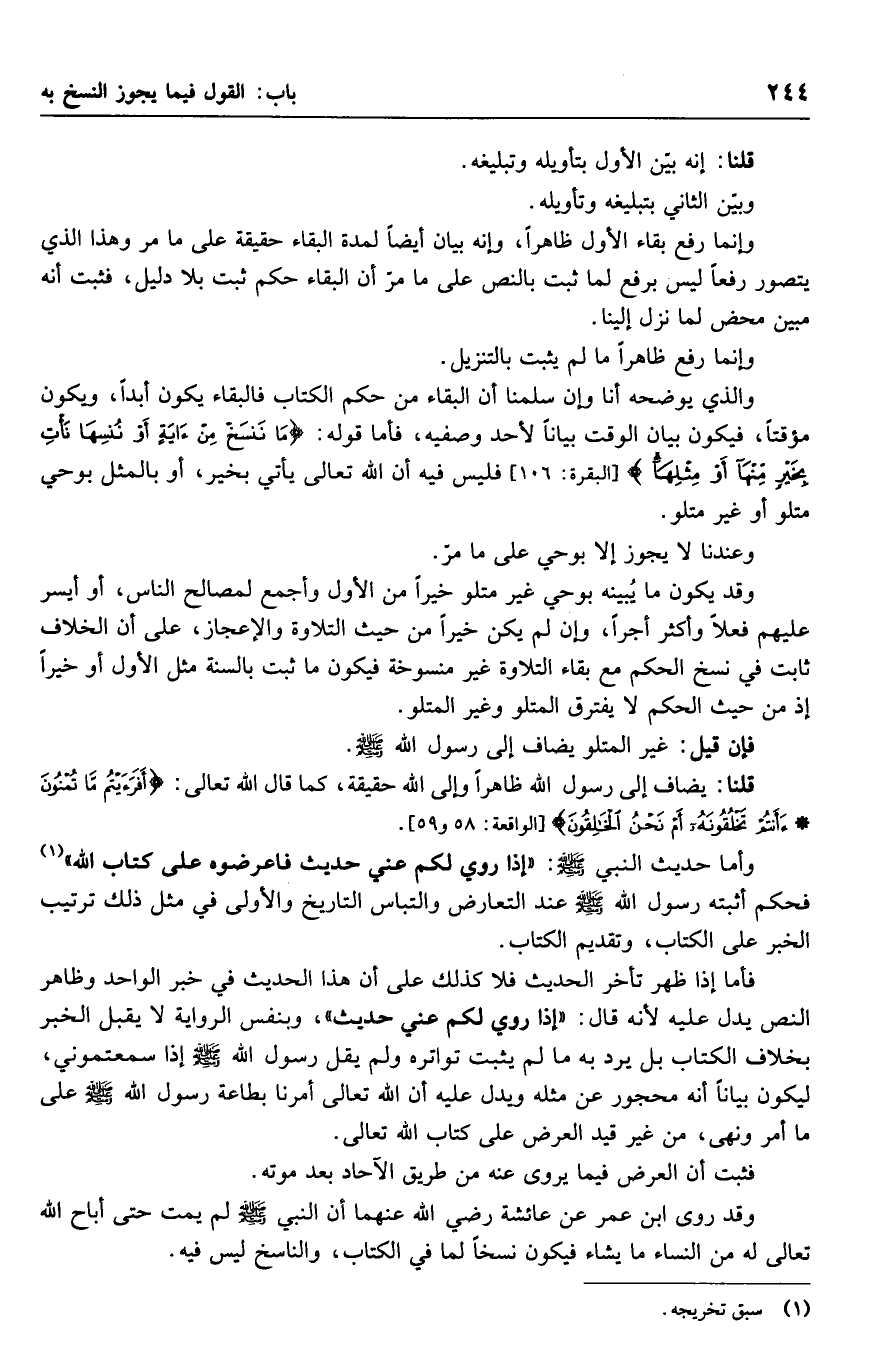فأما إذا ظهر تأخر الحديث فلا كذلك على أن هذا الحديث في خبر الواحد وظاهر النص يدل عليه لأنه قال: "إذا روي لكم عني حديث"، وبنفس الرواية لا يقبل الخبر بخلاف الكتاب بل يرد به ما لم يثبت تواتره ولم يقل رسول الله صلى الله عليه وسلم إذا سمعتموني، ليكون بيانًا أنه محجور عن مثله ويدل عليه أن الله تعالى أمرنا بطاعة رسول الله صلى الله عليه وسلم على ما أمر ونهى، من غير قيد العرض على كتاب الله تعالى.