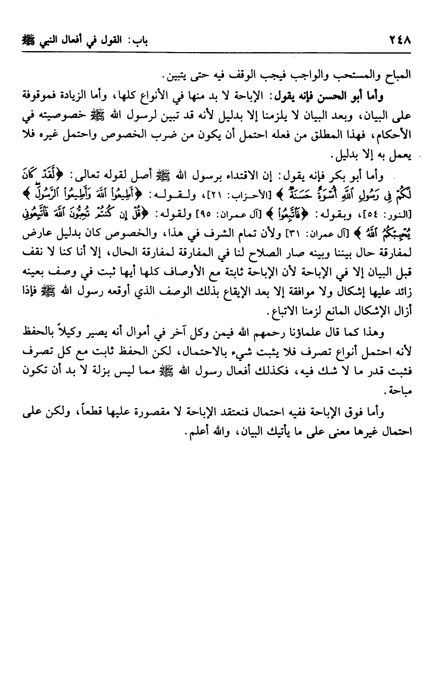 وأما أبو بكر فإنه يقول: إن الاقتداء برسول الله صلى الله عليه وسلم أصل لقوله تعالى: {لقد كان لكم في رسول الله أسوة حسنة}، ولقوله: {أطيعوا الله وأطيعوا الرسول}، وبقوله: {فاتبعوا} ولقوله: {قل إن كنتم تحبون الله فاتبعوني يحببكم الله} ولأن تمام الشرف في هذا، والخصوص كان بدليل عارض لمفارقة حال بيننا وبينه صار الصلاح لنا في المفارقة لمفارقة الحال، إلا أنا كنا لا نقف قبل البيان إلا في الإباحة لأن الإباحة ثابتة مع الأوصاف كلها أيها ثبت في وصف بعينه زائد عليها إشكال ولا موافقة إلا بعد الإيقاع بذلك الوصف الذي أوقعه رسول الله صلى الله عليه وسلم فإذا أزال الإشكال المانع لزمنا الاتباع.
