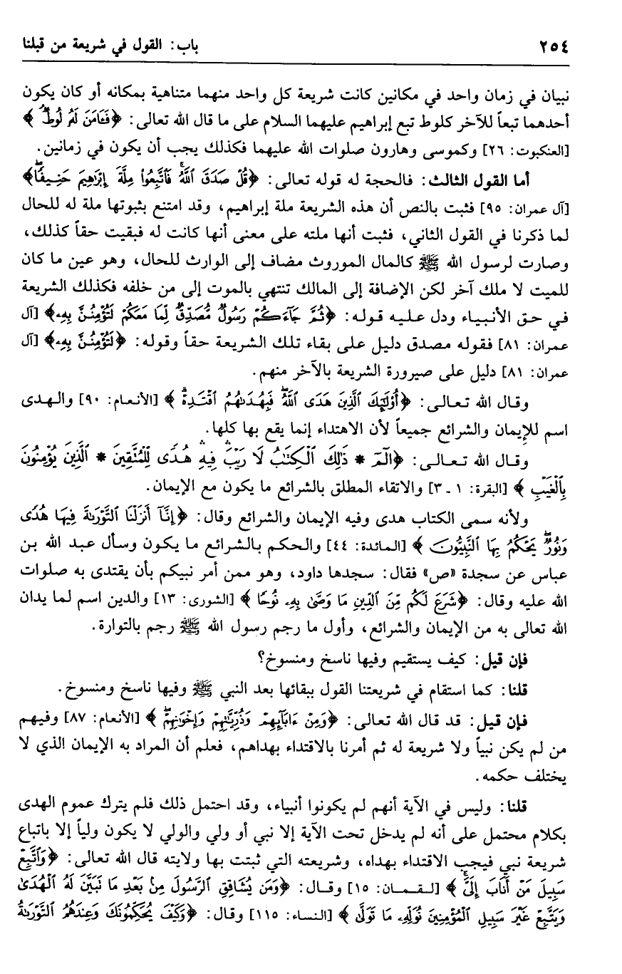 أما القول الثالث: فالحجة له قوله تعالى: {قل صدق الله فاتبعوا ملة إبراهيم حنيفًا} فثبت بالنص أن هذه الشريعة ملة إبراهيم، وقد امتنع بثبوتها ملة له للحال لما ذكرنا في القول الثاني، فثبت أنها ملته على معنى أنها كانت له فبقيت حقًا كذلك، وصارت لرسول الله صلى الله عليه وسلم كالمال الموروث مضاف إلى الوارث للحال، وهو عين ما كان للميت لا ملك آخر لكن الإضافة إلى المالك تنتهي بالموت إلى من خلفه فكذلك الشريعة في حق الأنبياء ودل عليه قوله: {ثم جاءكم رسول مصدق لما معكم لتؤمنن به} فقوله مصدق دليل على بقاء تلك الشريعة حقًا وقوله: {لتؤمنن به} دليل على صيرورة الشريعة بالآخر منهم.